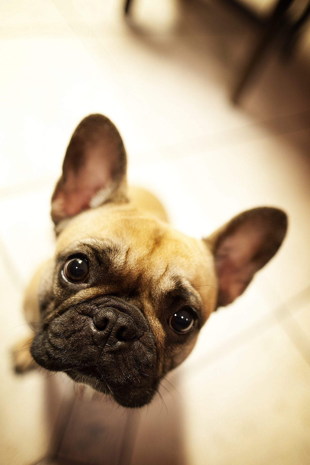 Painting of a fawn French bulldog looking down at the viewer