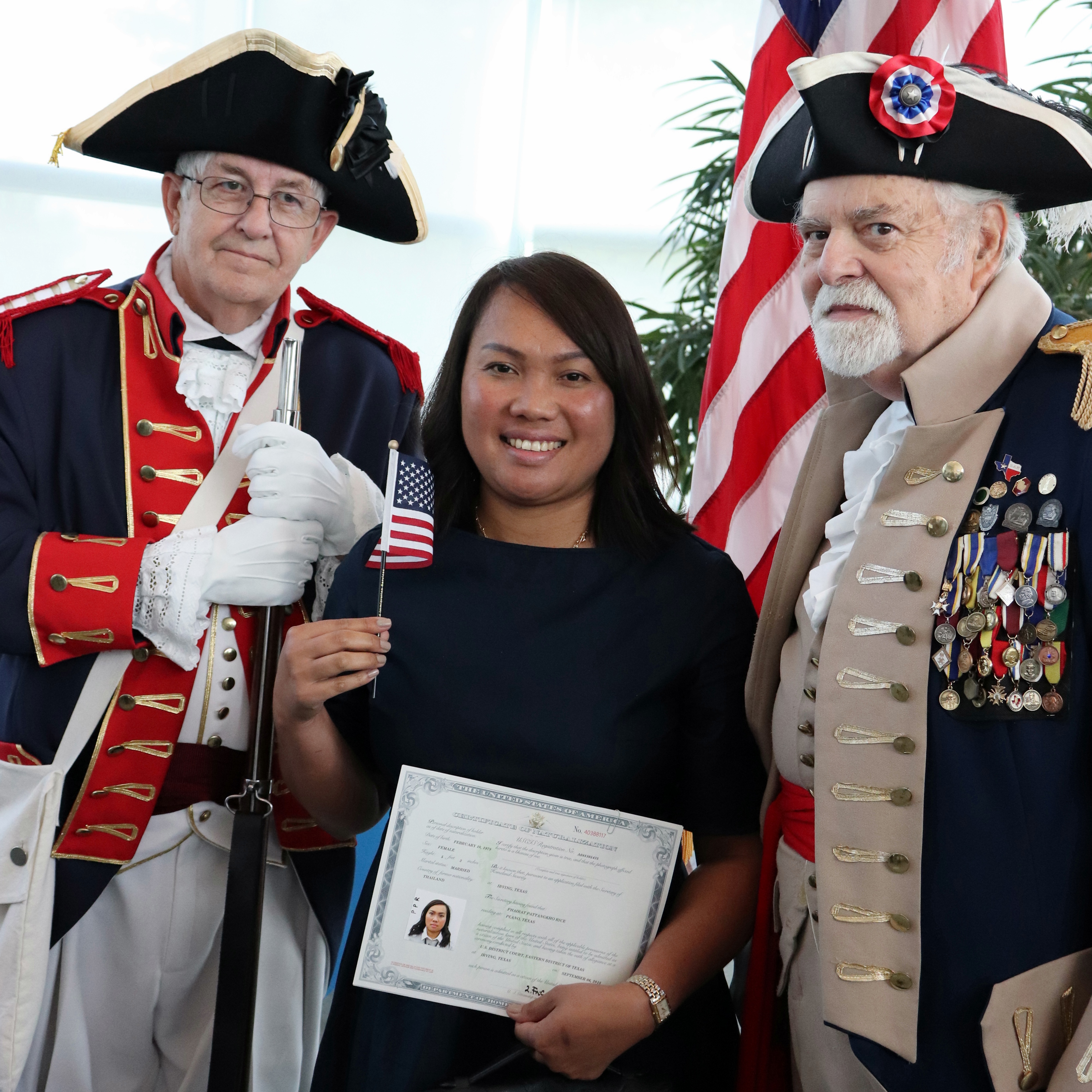 Painted portrait of a woman holding a small American flag and certificate, flanked by two men in colonial-era military uniforms.