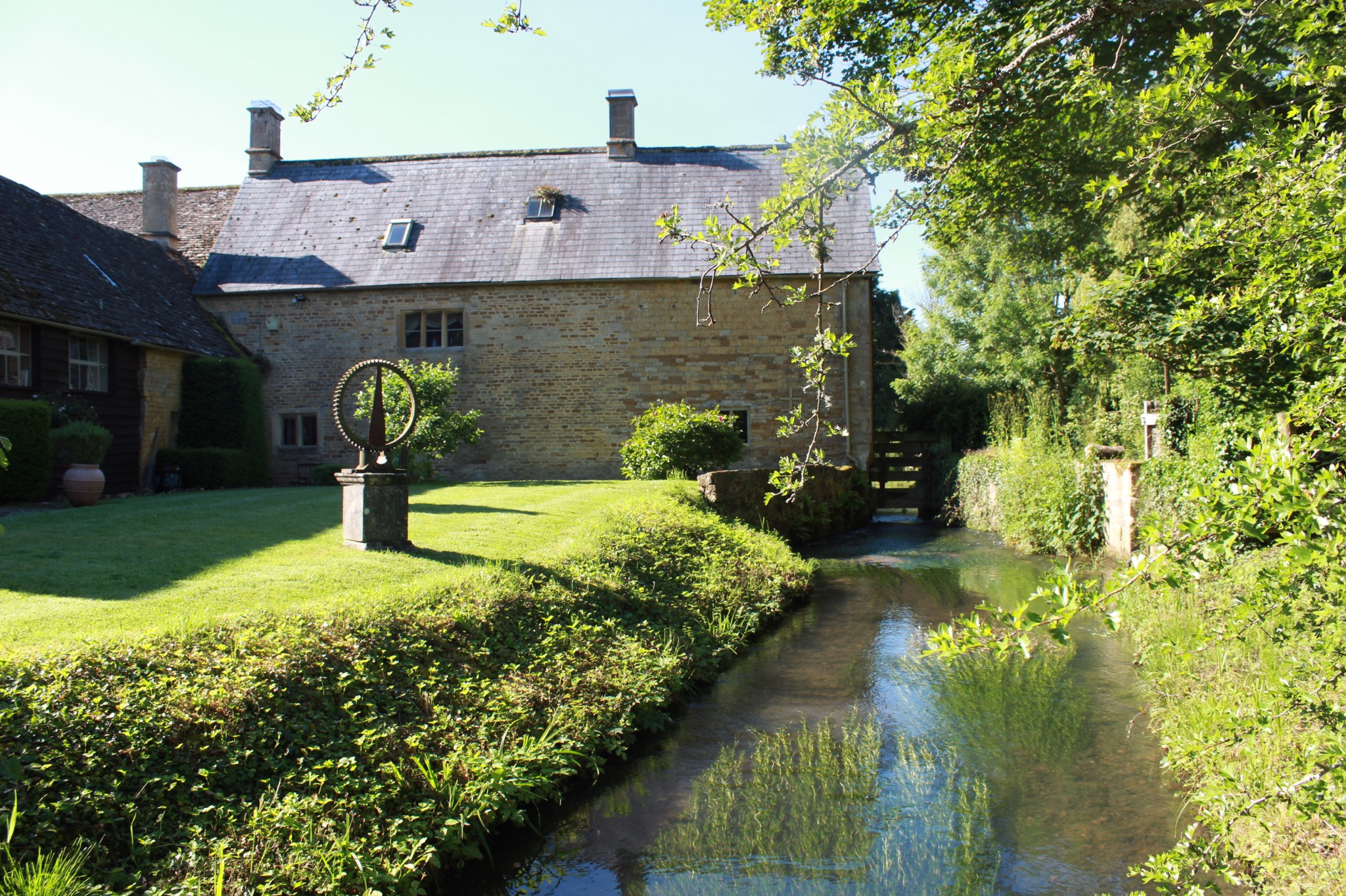 Painting of a stone building and watermill, with a sundial in the foreground.