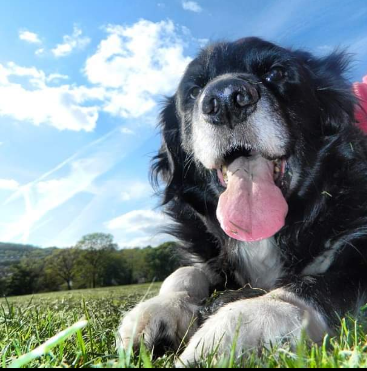 Painting of a happy black dog panting with its tongue out, lying in the grass under a blue sky.
