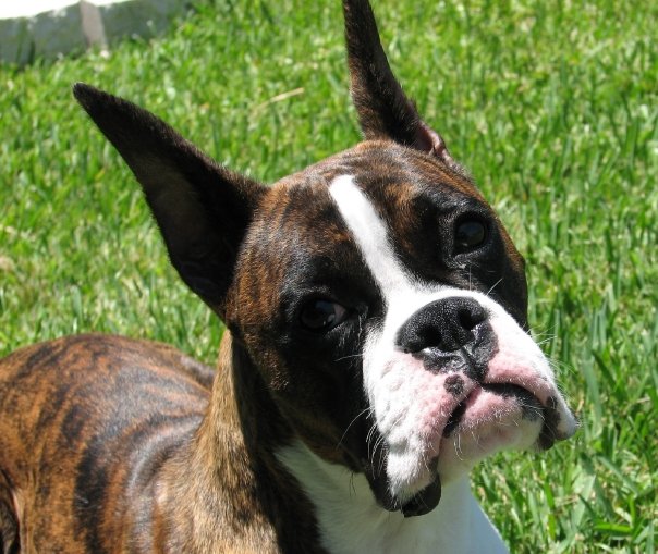 Painting of three boxer dogs against a green background.