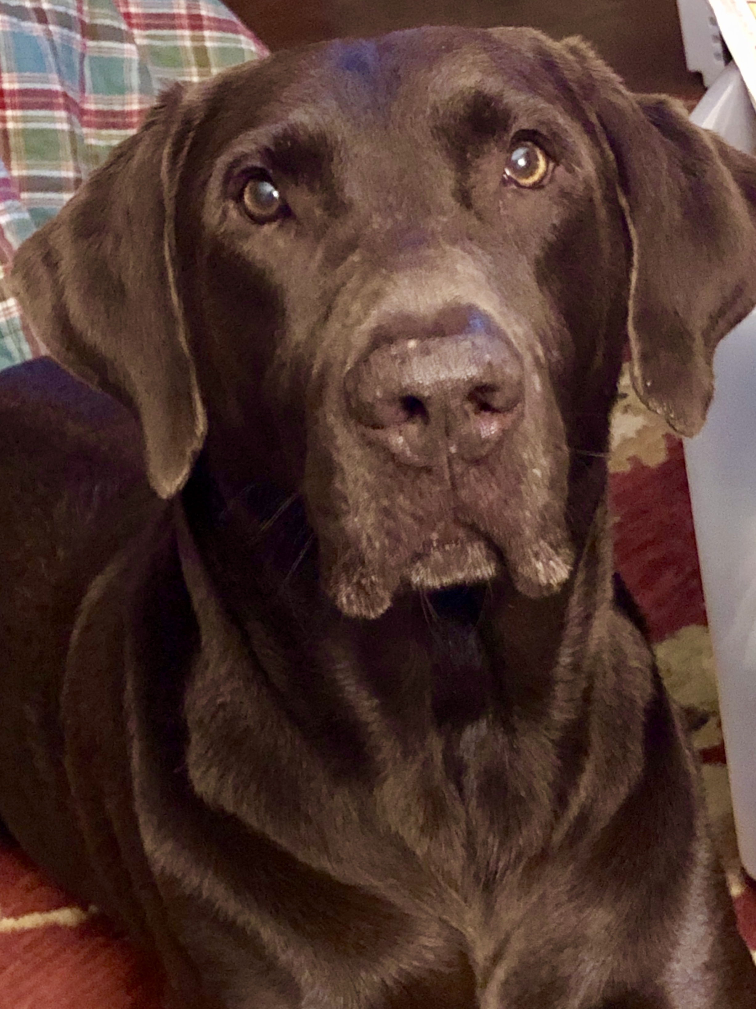 Painting of a chocolate Labrador Retriever.