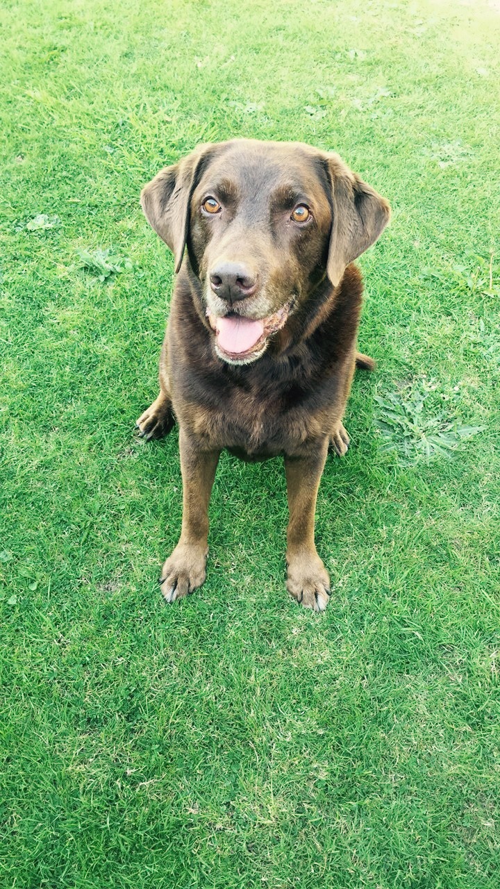 Painting of a chocolate Labrador Retriever sitting in green grass.