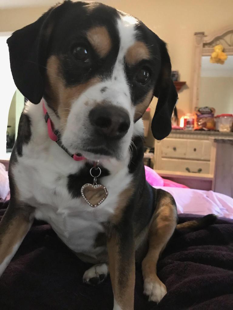 Painting of a tri-color dog wearing a heart-shaped tag.