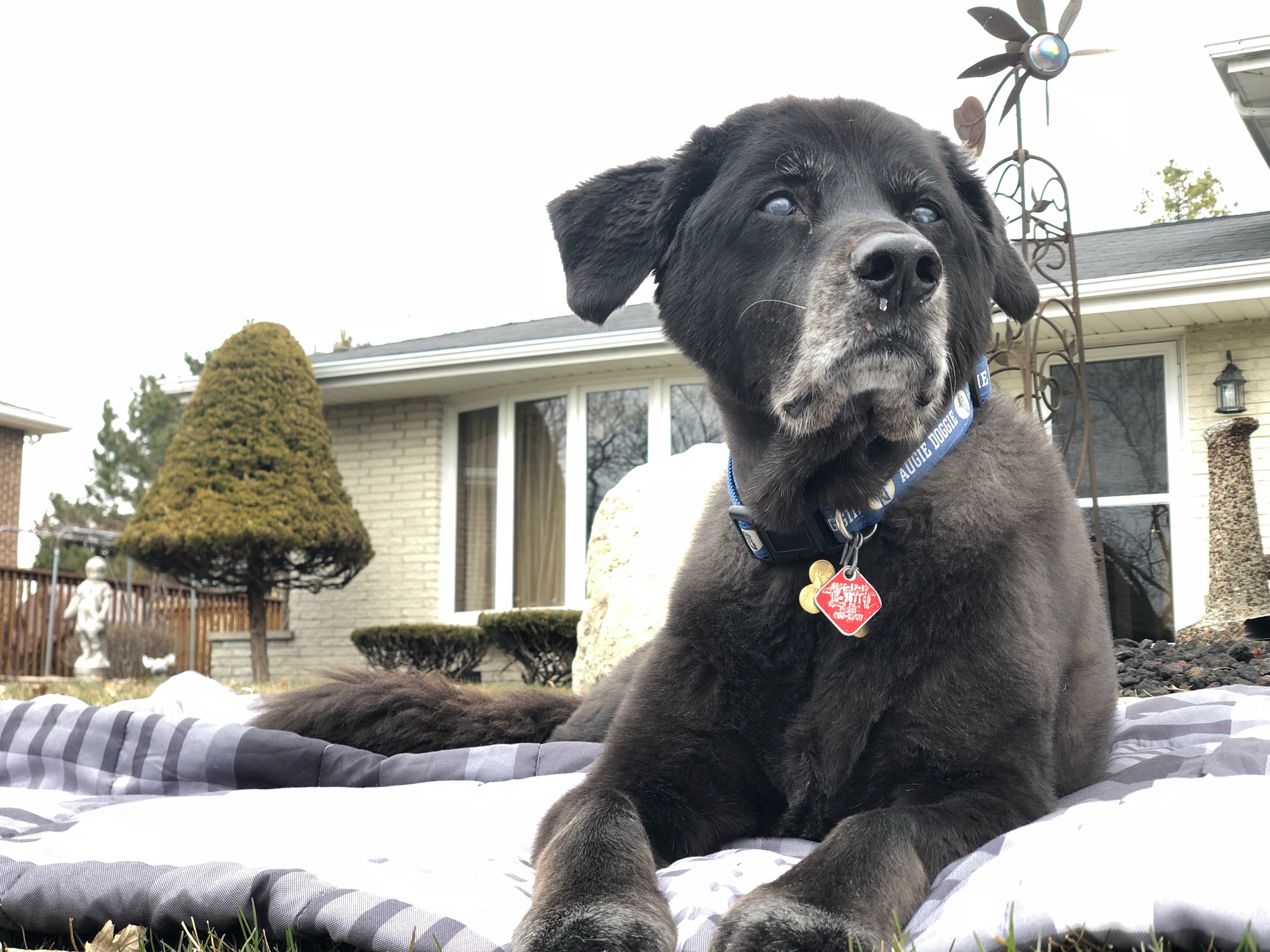 Painting of a black dog with blue eyes wearing a blue collar and tag, sitting outside a house in the snow.