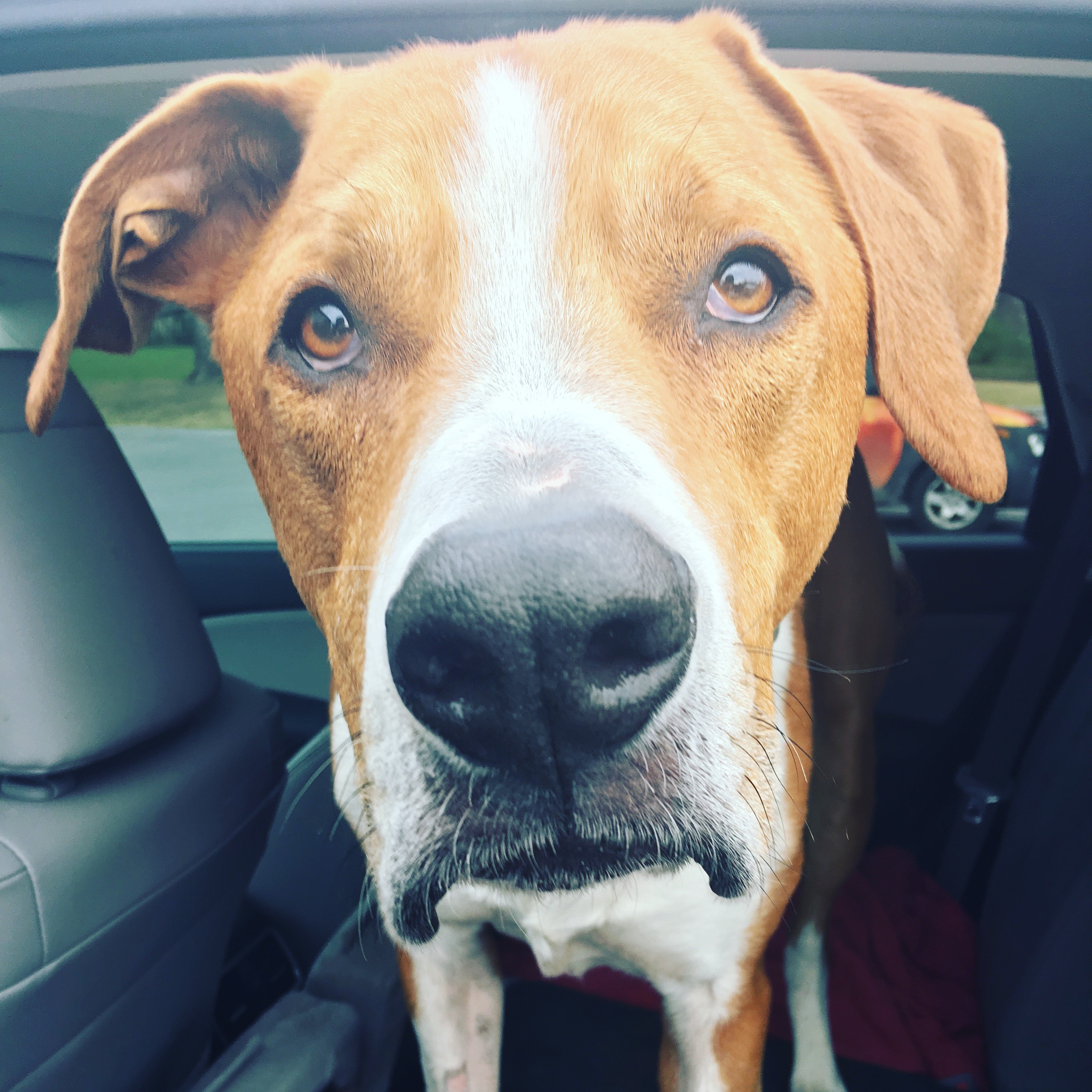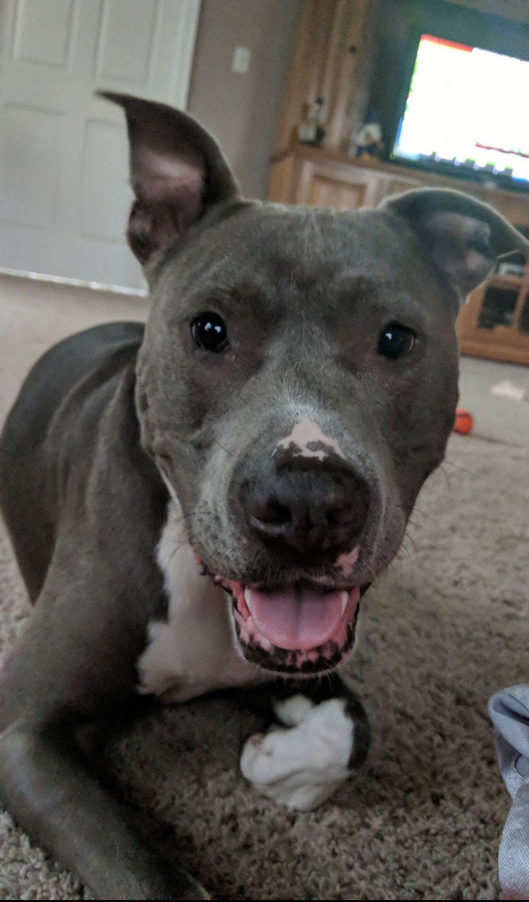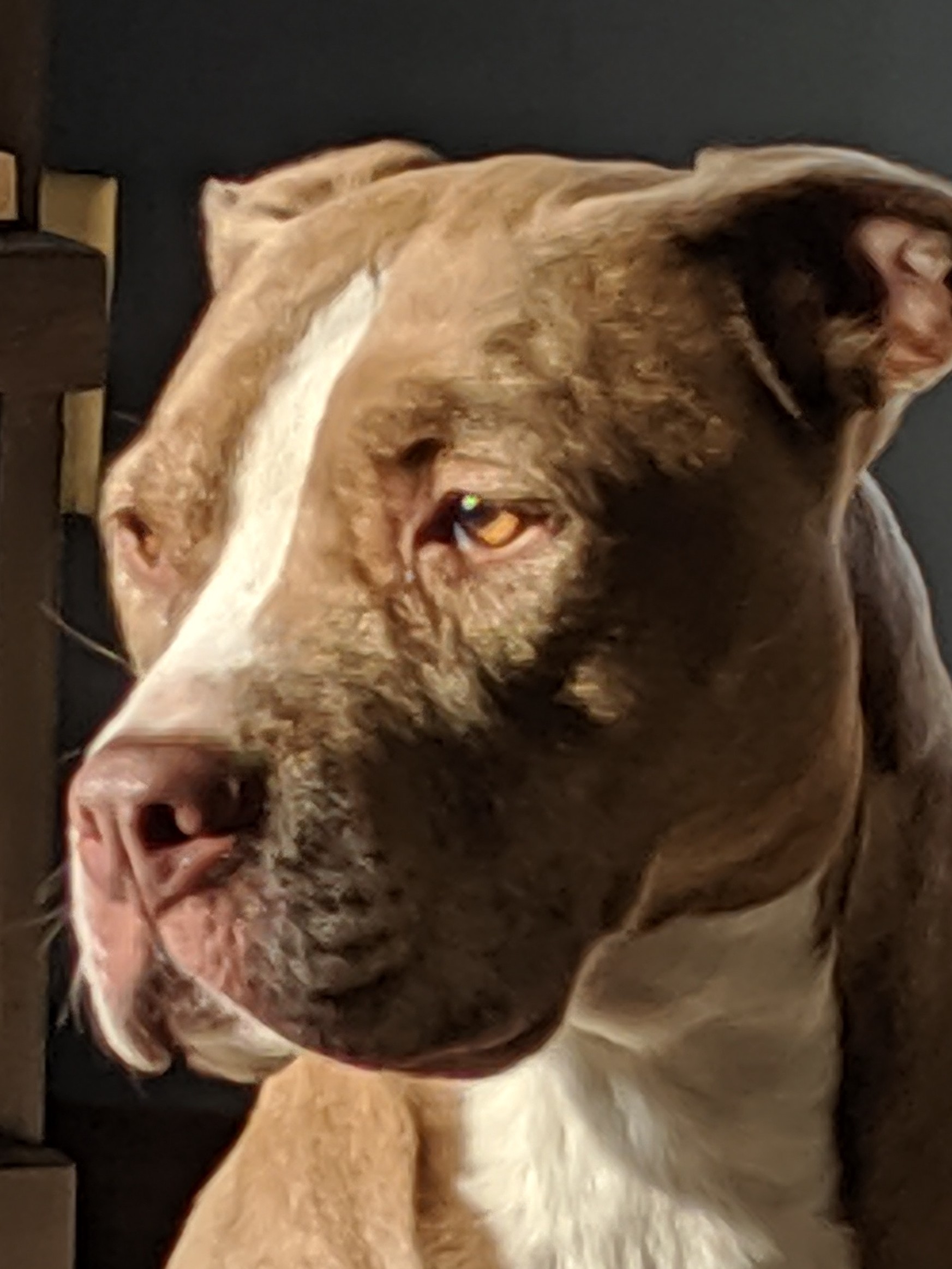 Painting of a brown and white Pit Bull Terrier`s head and shoulders.