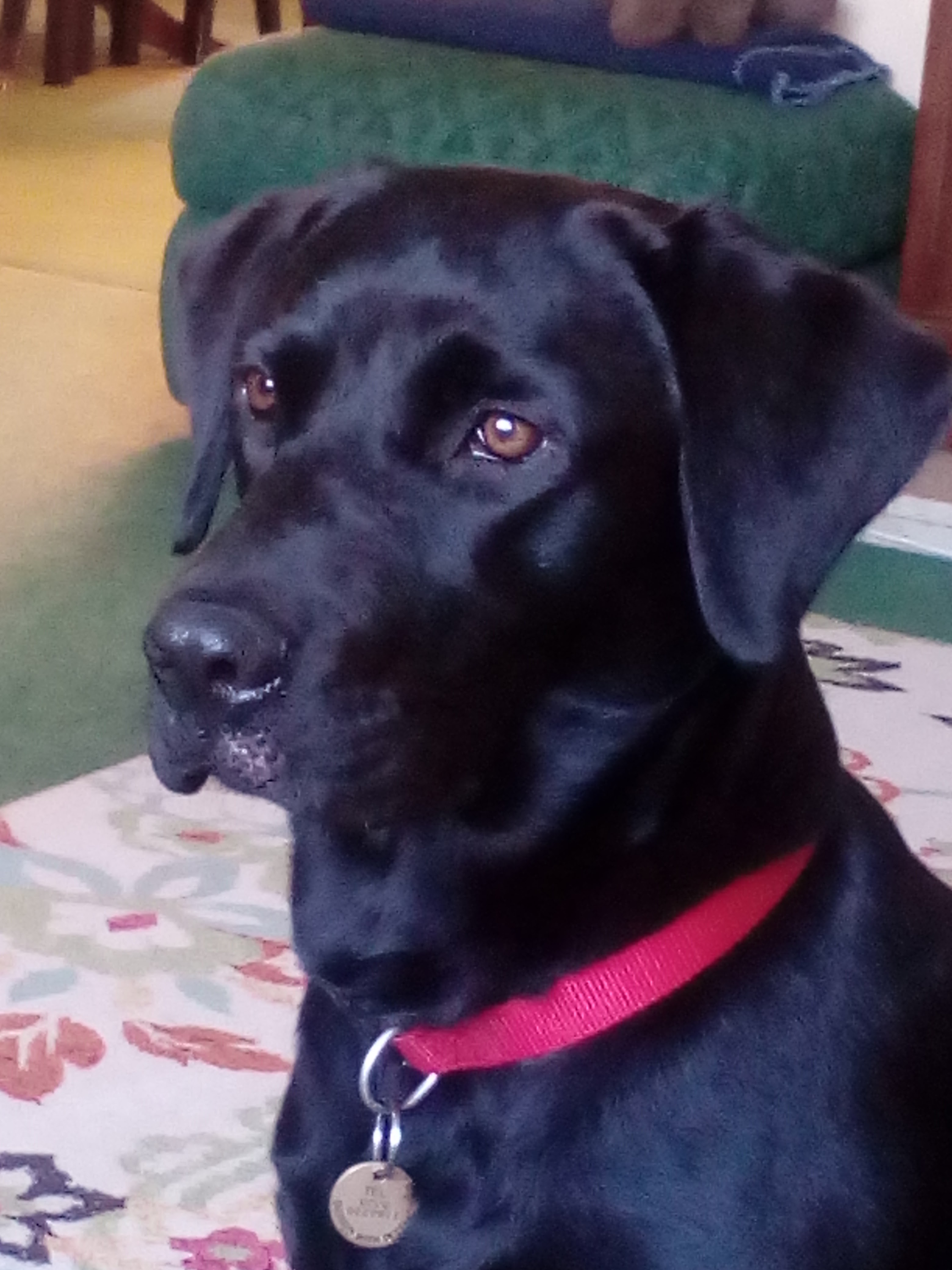Painting of a black Labrador wearing a red collar and tag.