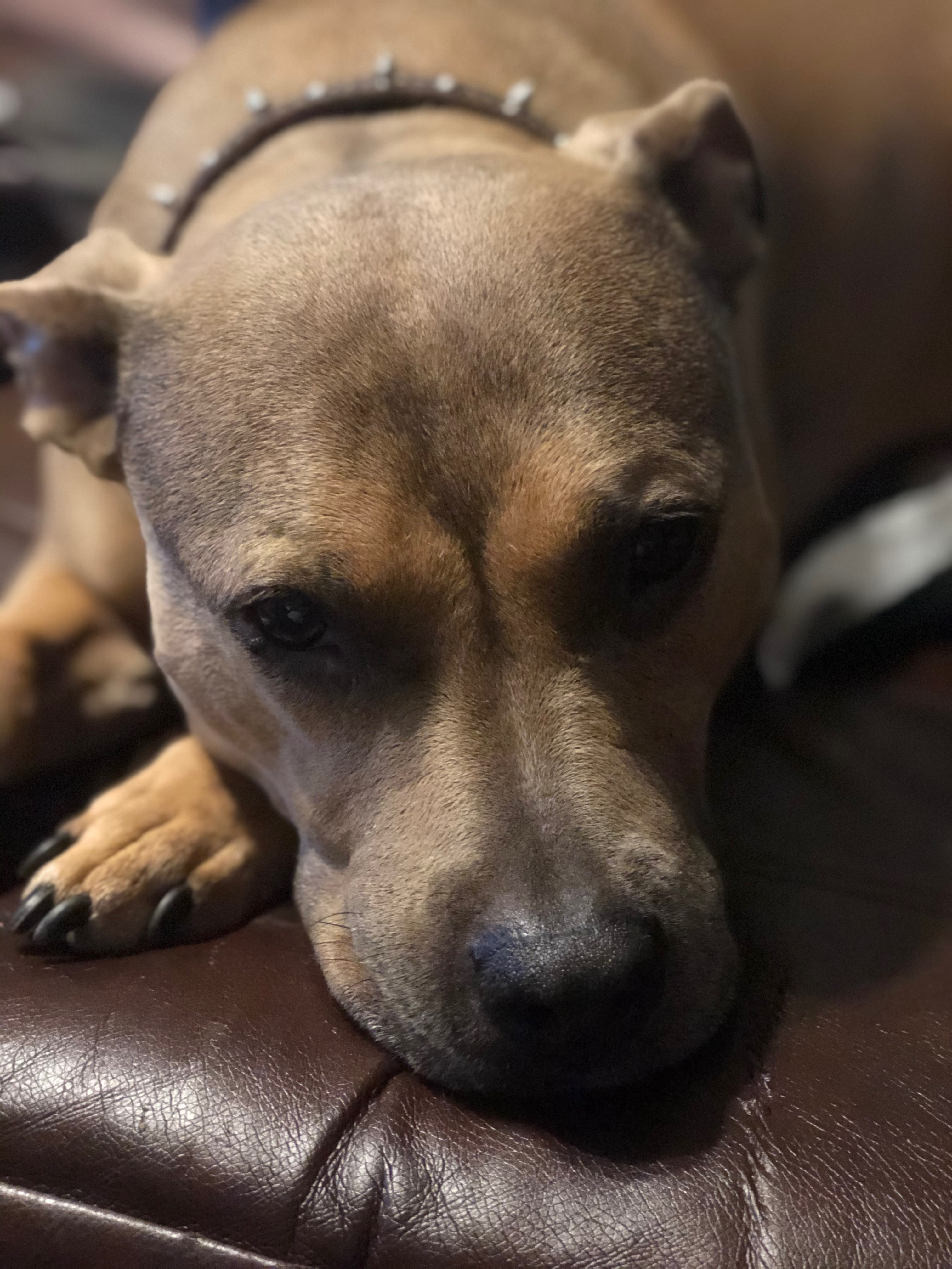 Painting of a light brown dog resting its head on a dark brown surface.