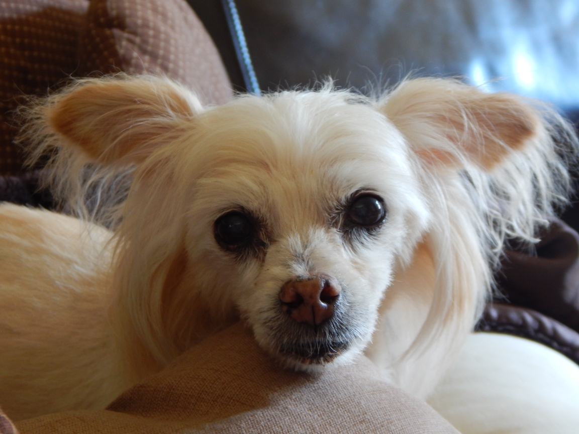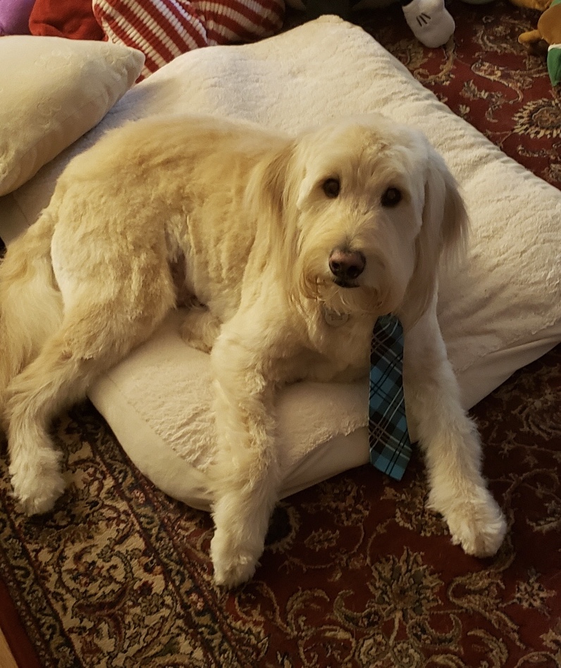 Painting of a long-haired, light cream-colored dog.