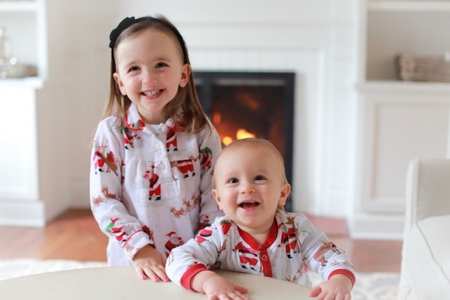 Painting of two young children in matching pajamas near a fireplace.