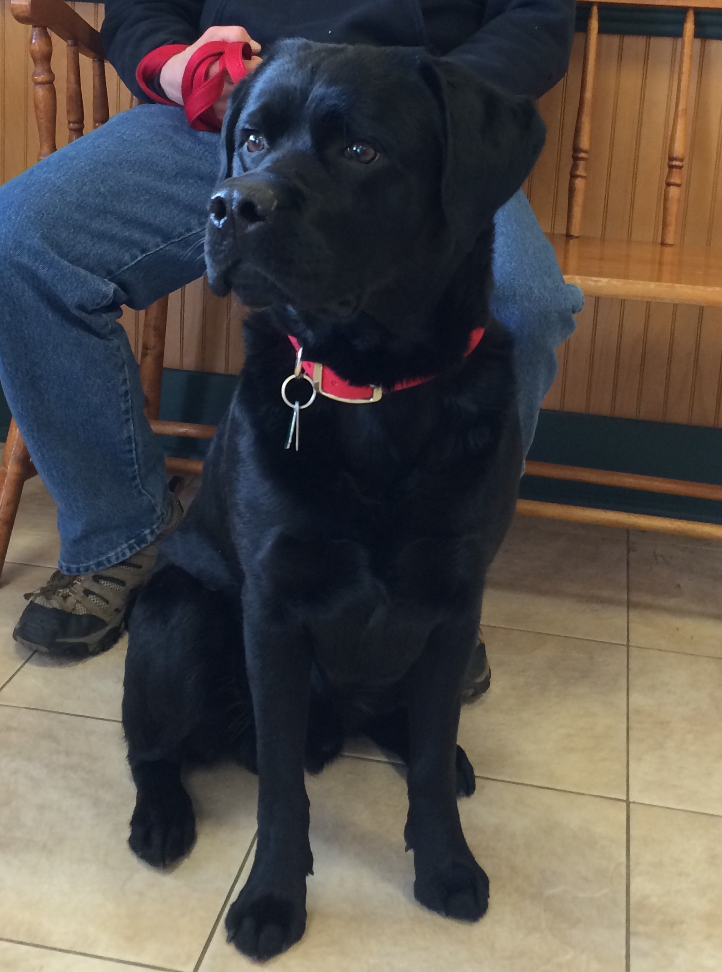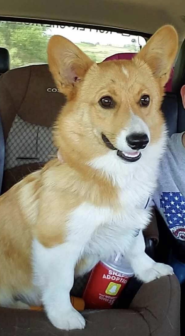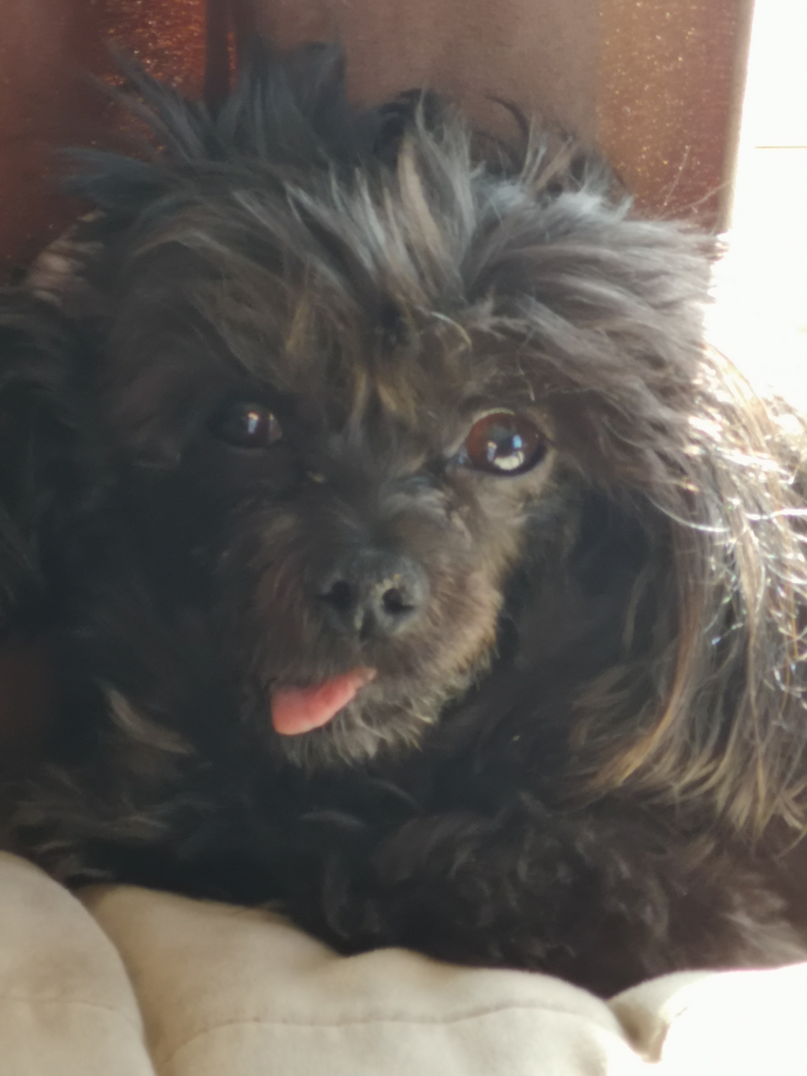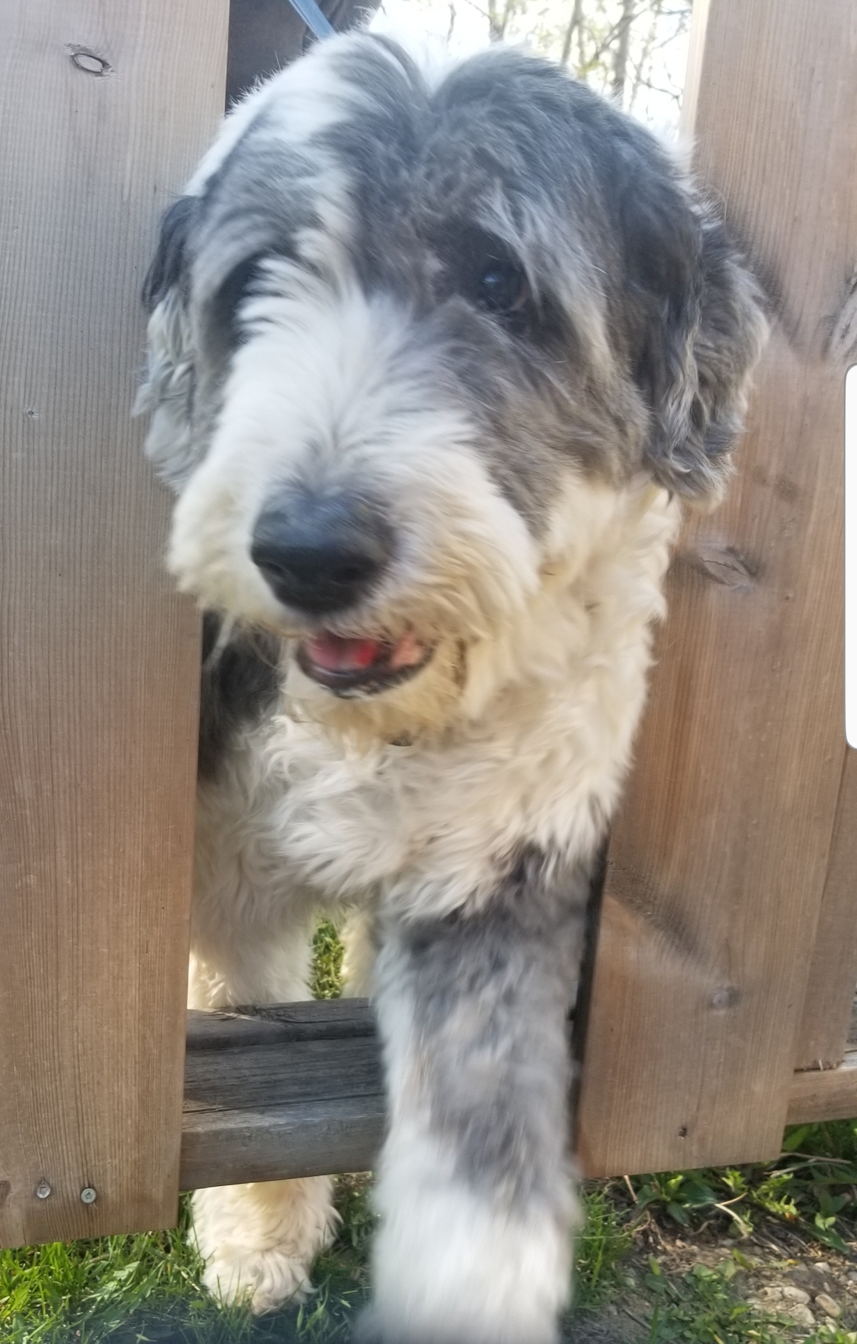 Painting of a fluffy gray and white dog peeking through a wooden gate.