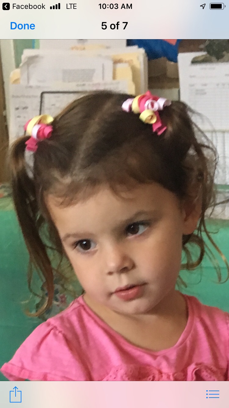 Oil painting portrait of a young girl with pigtails and pink bows in her hair.