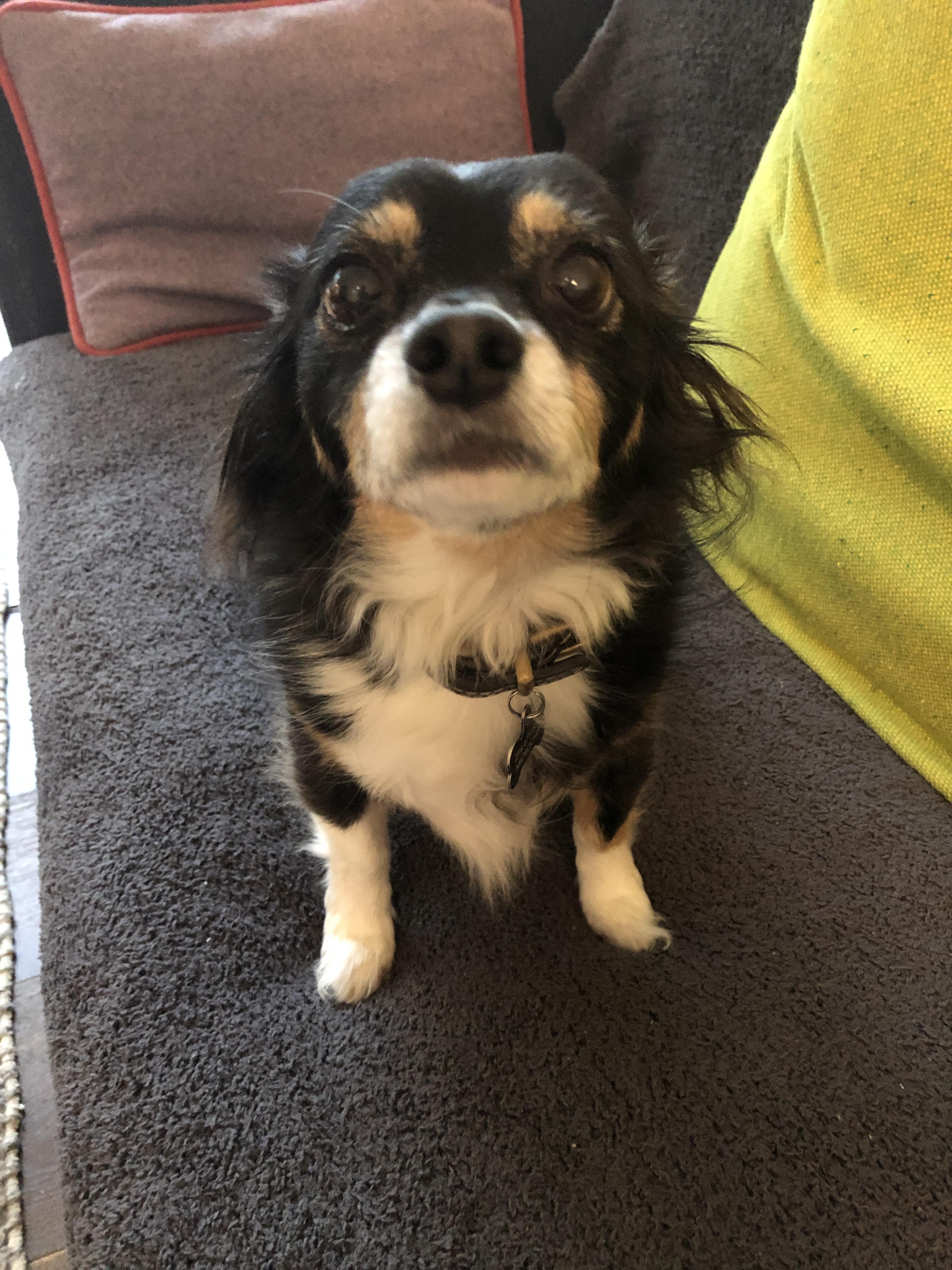 Painting of a small, long-haired dog with black, tan, and white fur, sitting and looking up at the viewer.