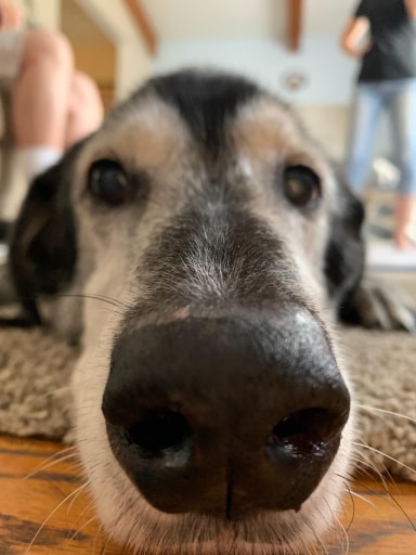 Painting of a dog`s face, close-up