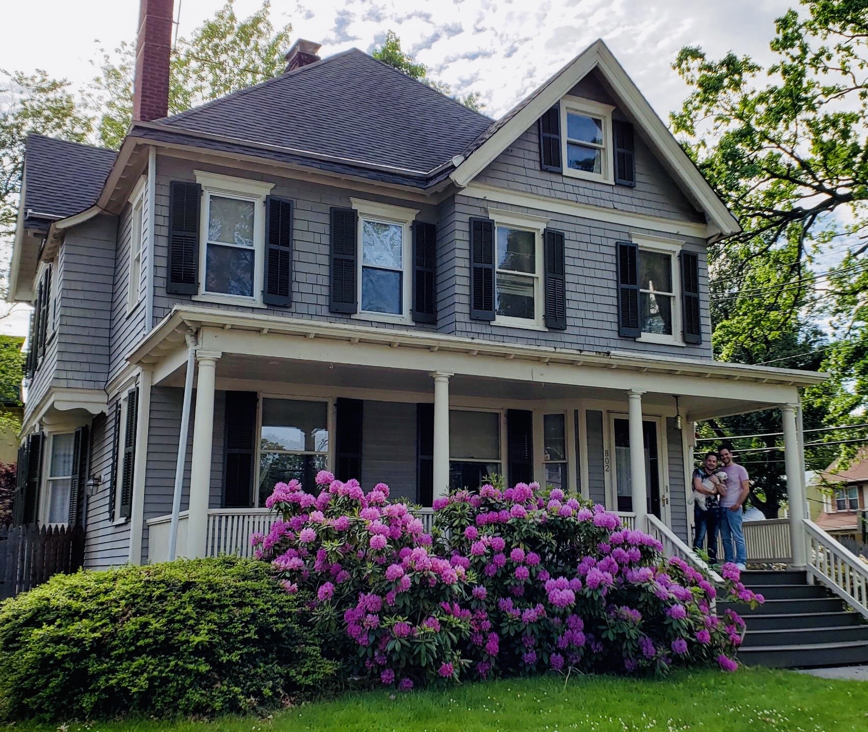 Painting of a gray house with a porch, blooming rhododendrons, and a family standing on the steps.