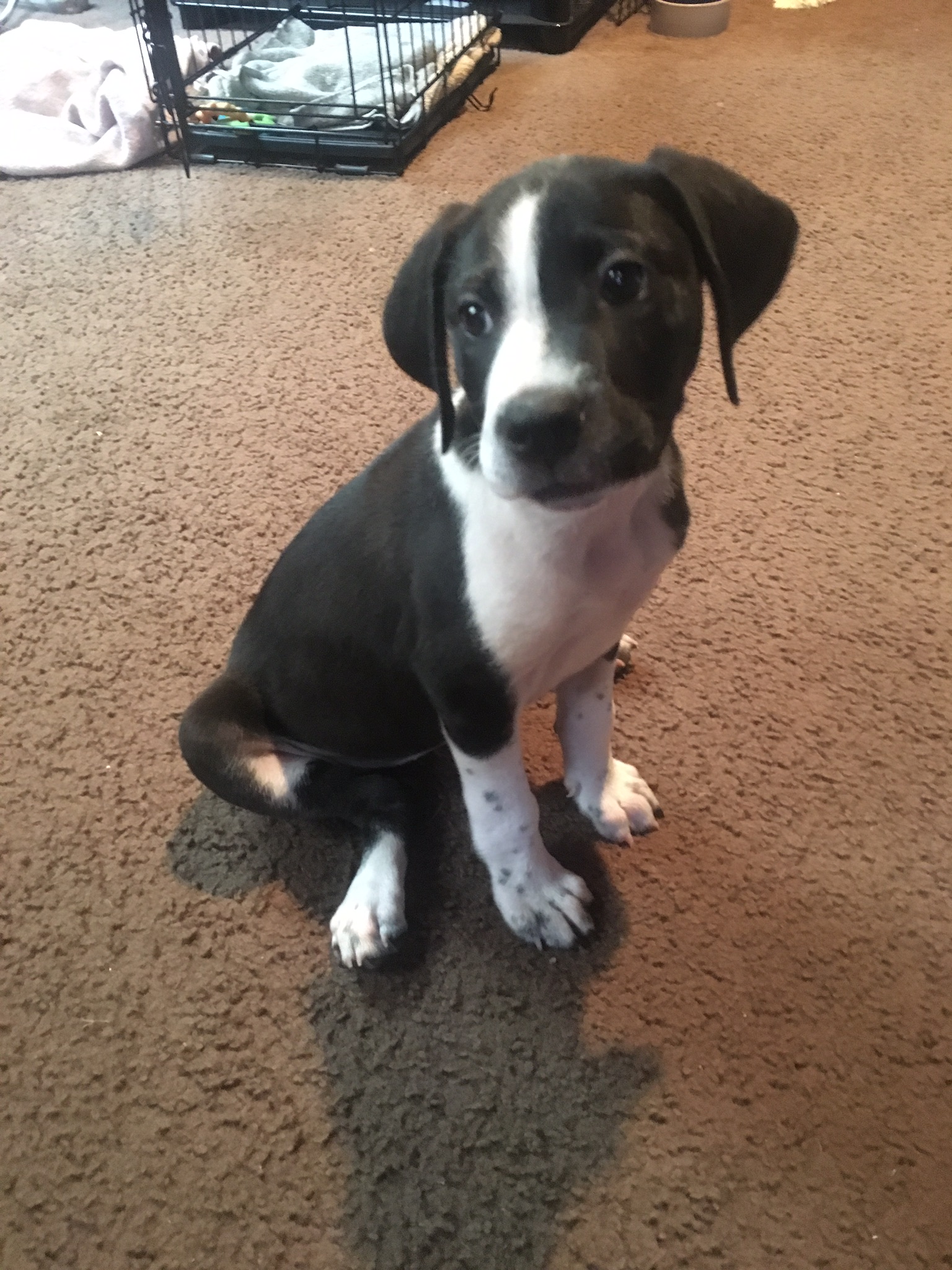 Painting of a black and white puppy sitting on a red background