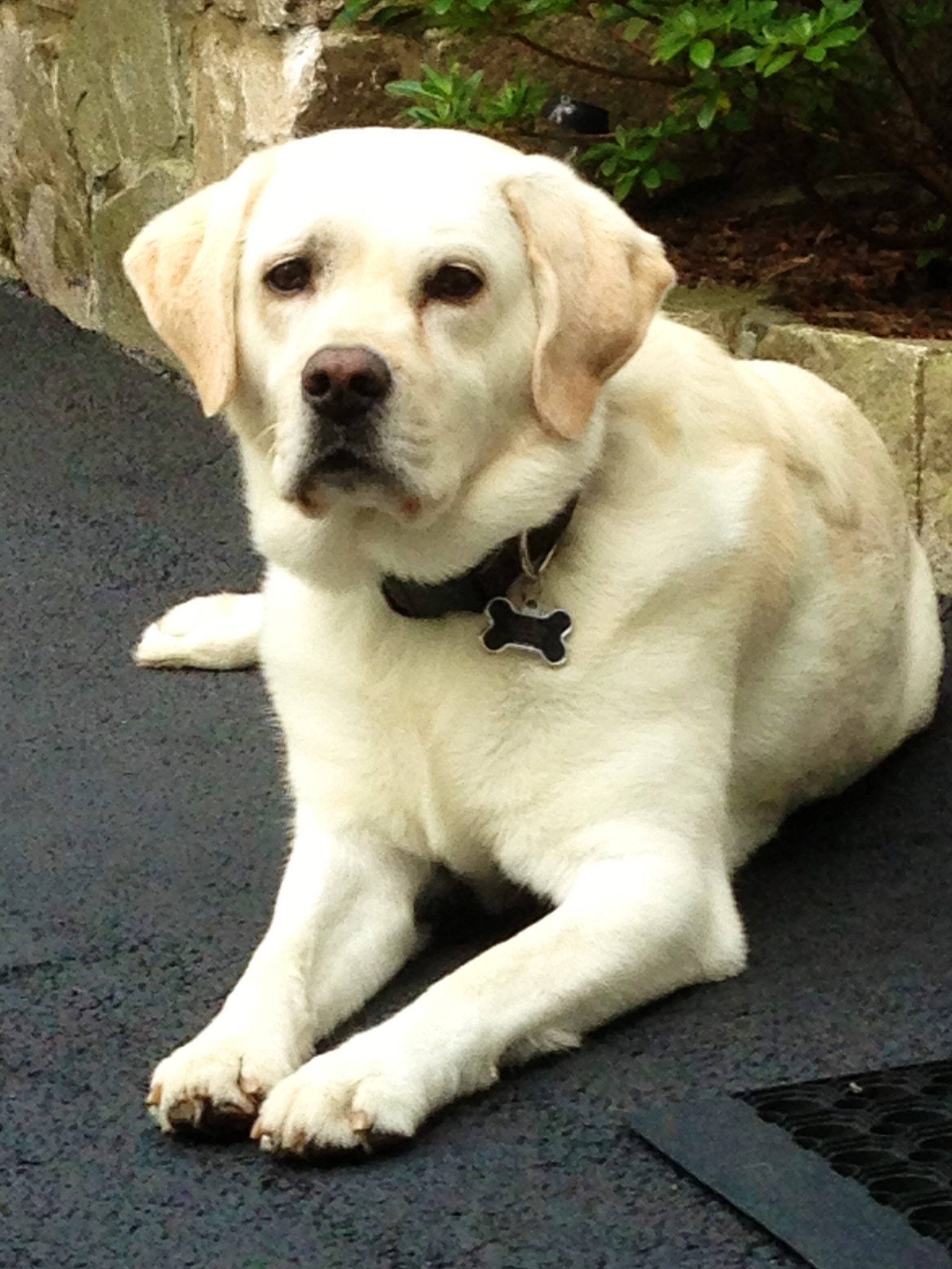 Painting of a yellow Labrador Retriever wearing a collar with a Posh tag.