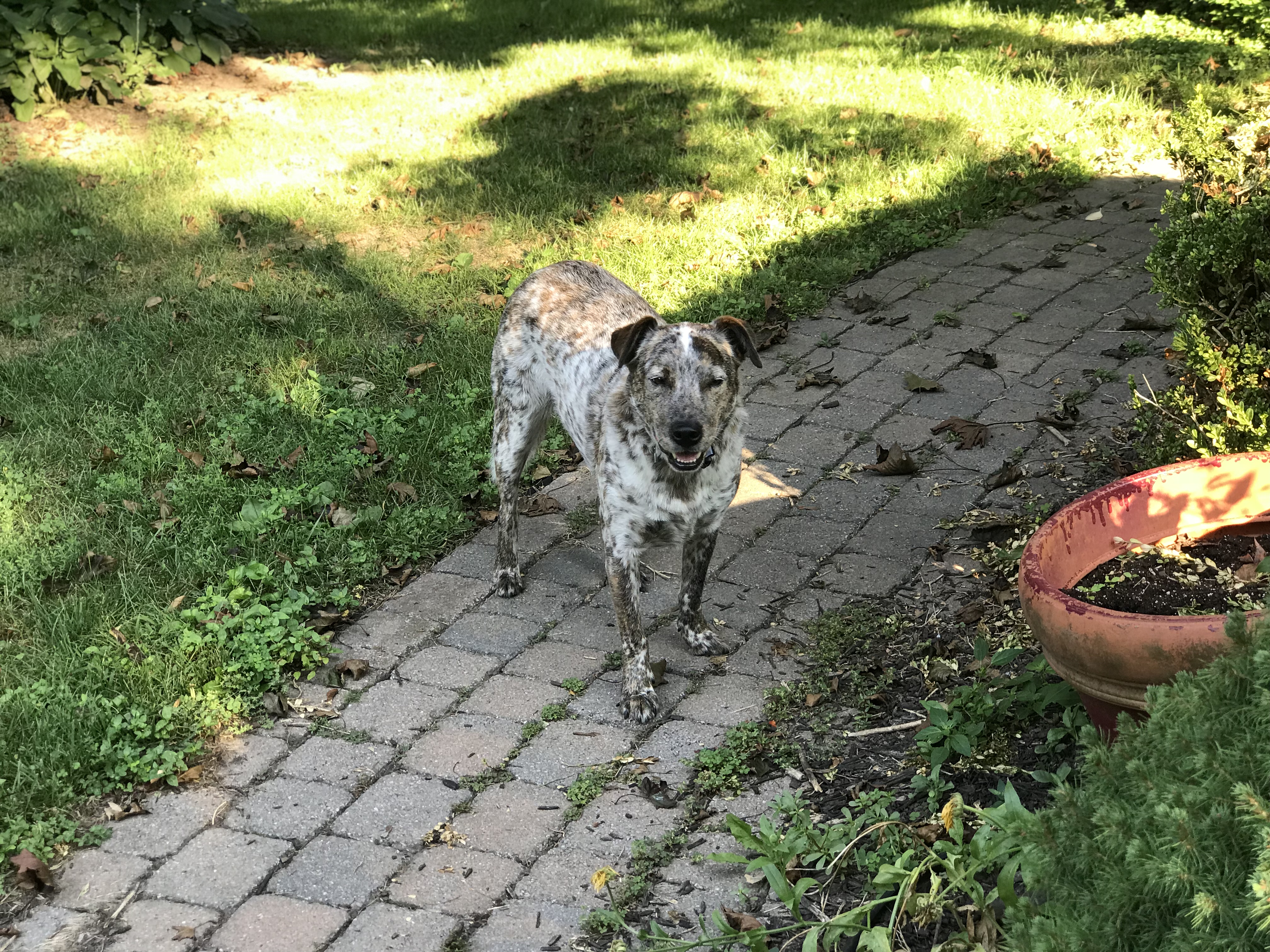 Painting of a happy dog on green grass
