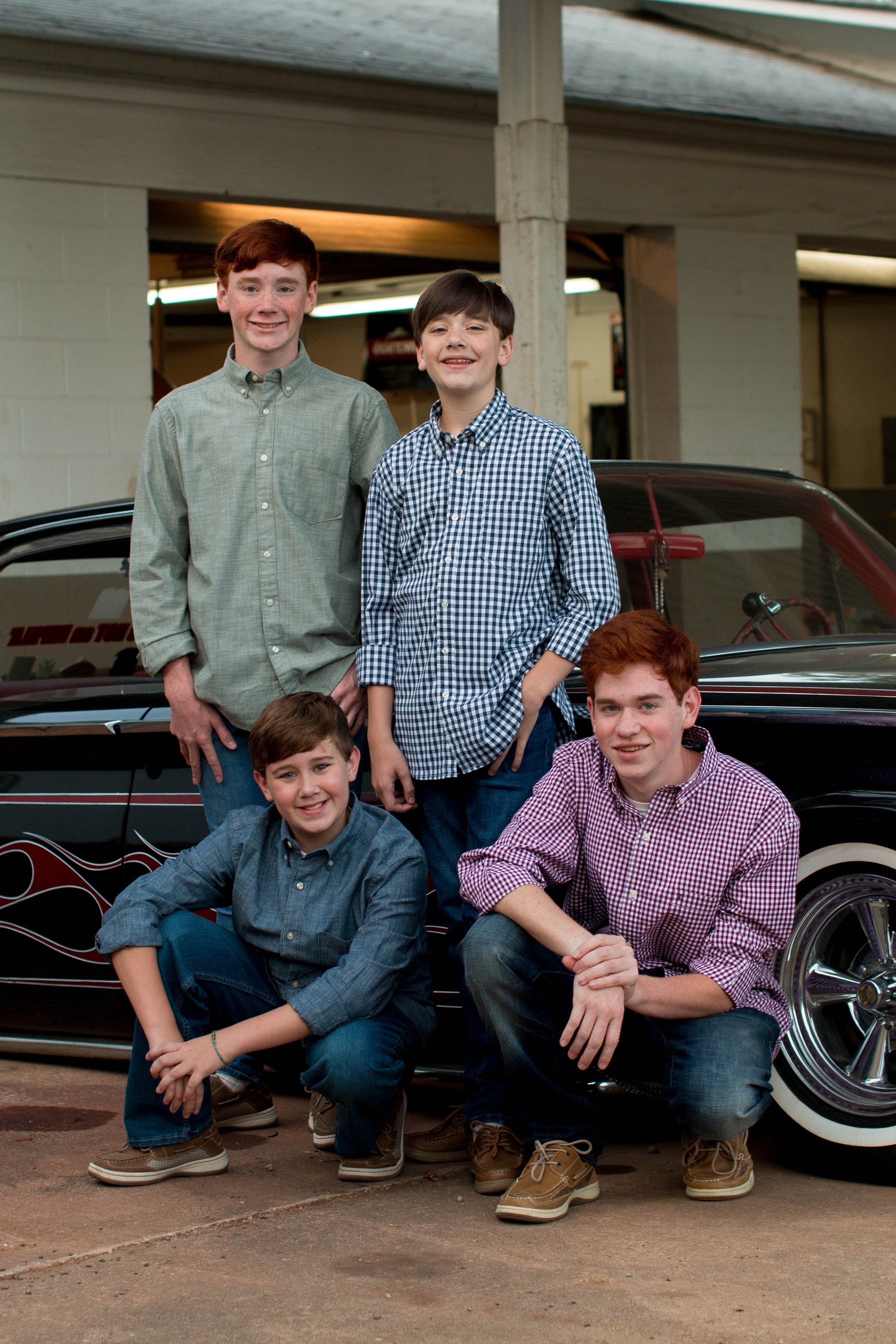 Four teenage boys posing by a classic car, painted portrait.