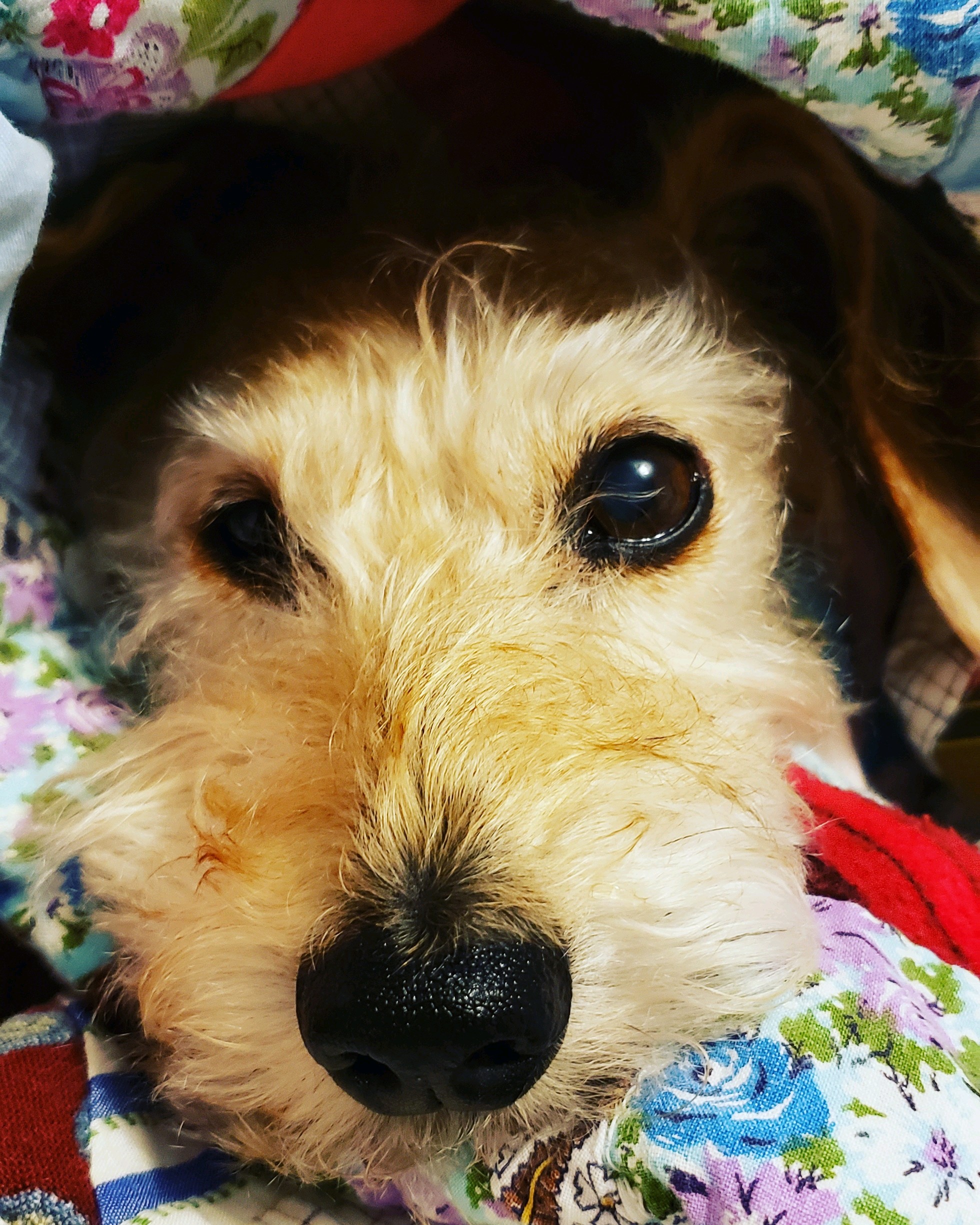 Painting of a light brown dog wearing a hat, peeking from behind a floral fabric