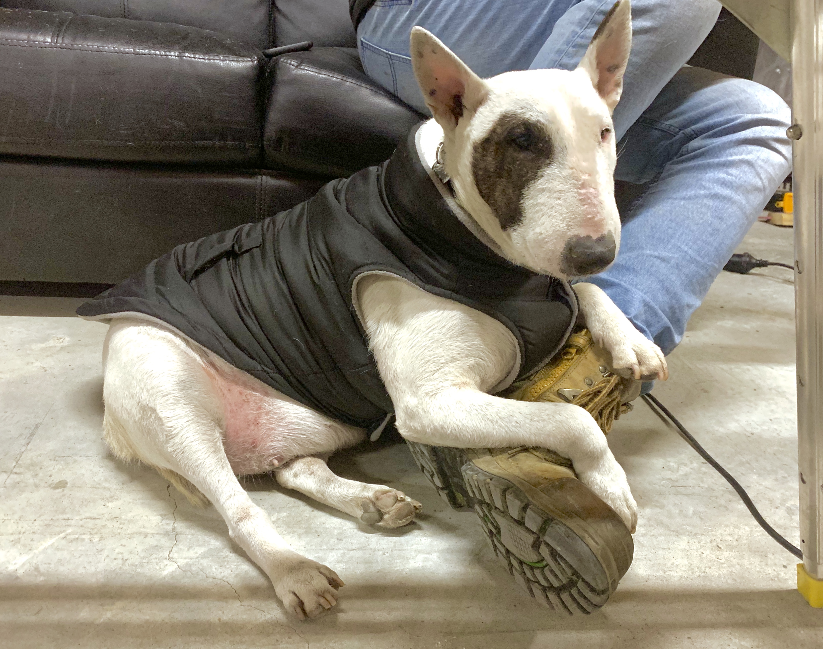 Painting of a bull terrier wearing a dark vest, resting near a person`s legs and boots.