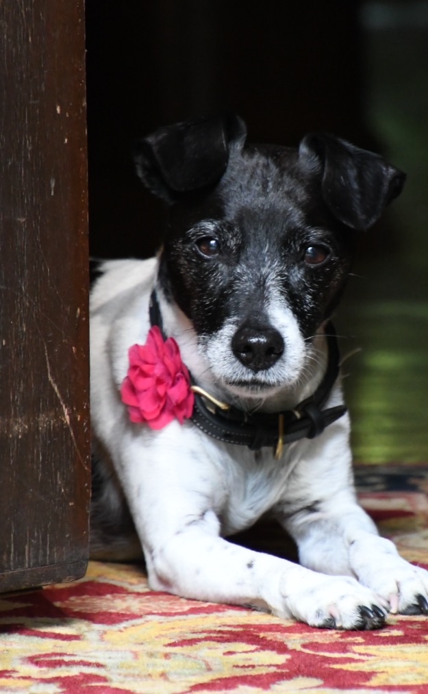 Painting of a black and white dog wearing a collar and holding a pink flower.