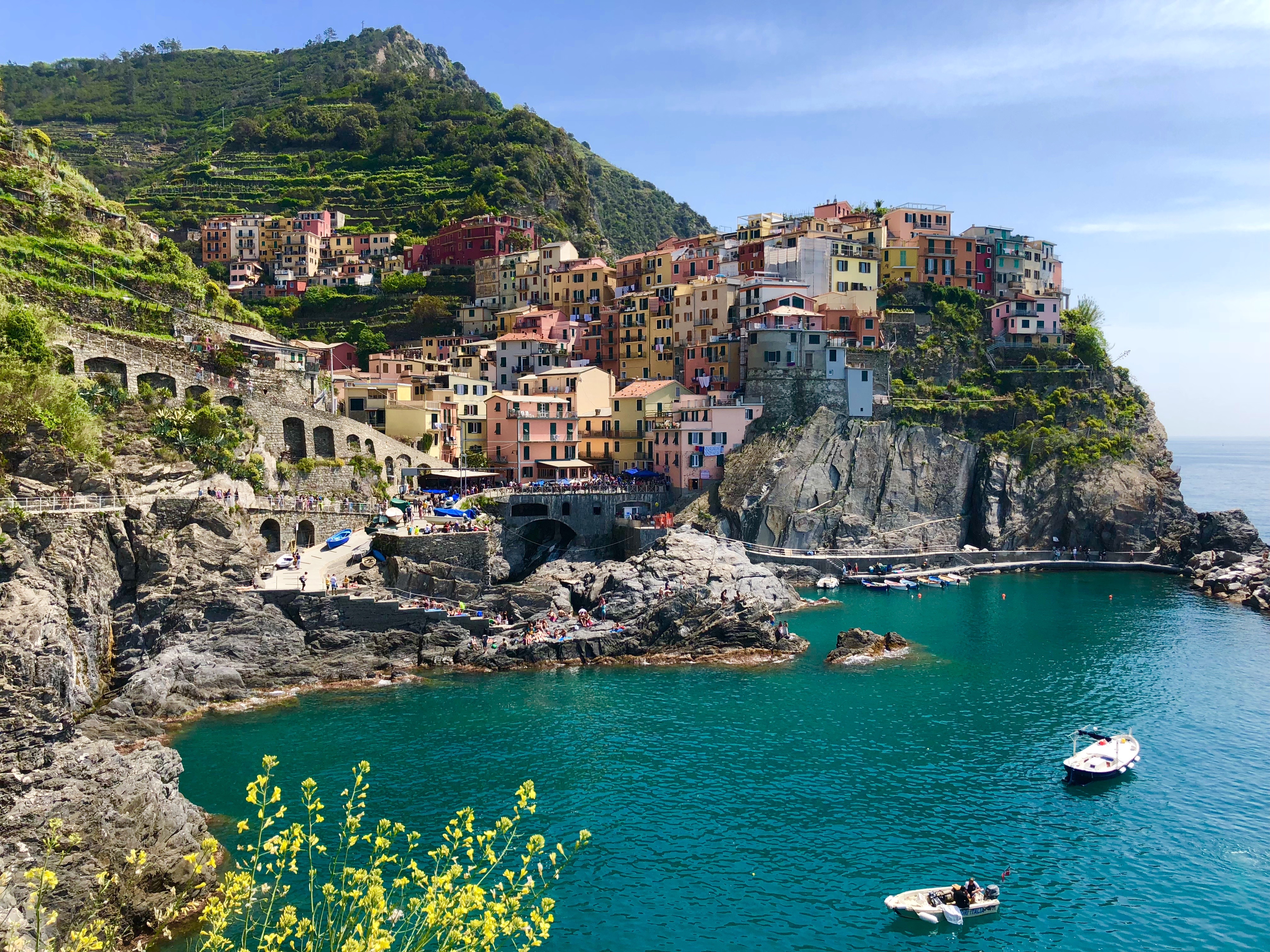 Colorful houses on a hillside overlooking a calm blue sea.