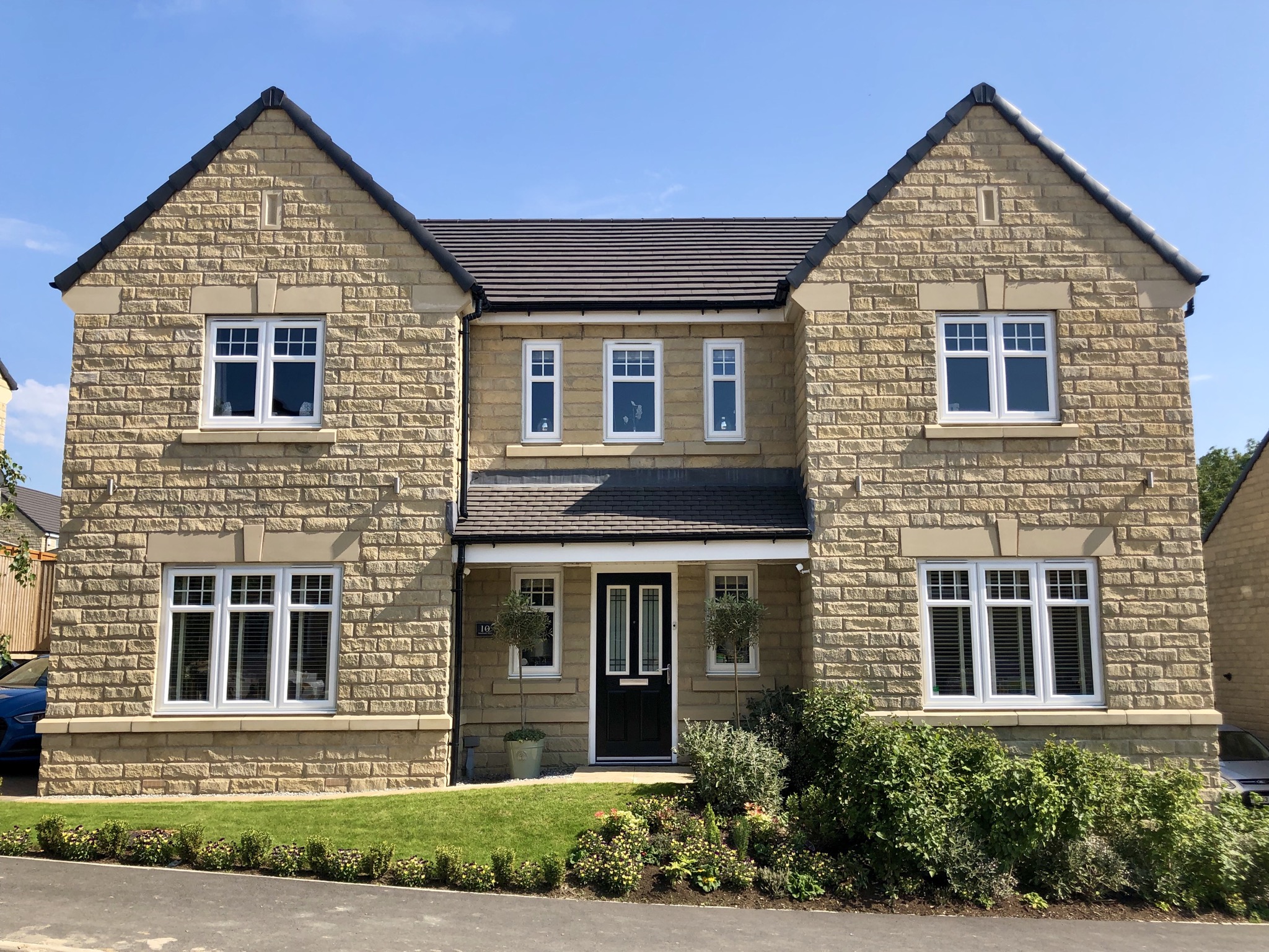 Painting of a two-story light brown brick house with white windows and a black door.