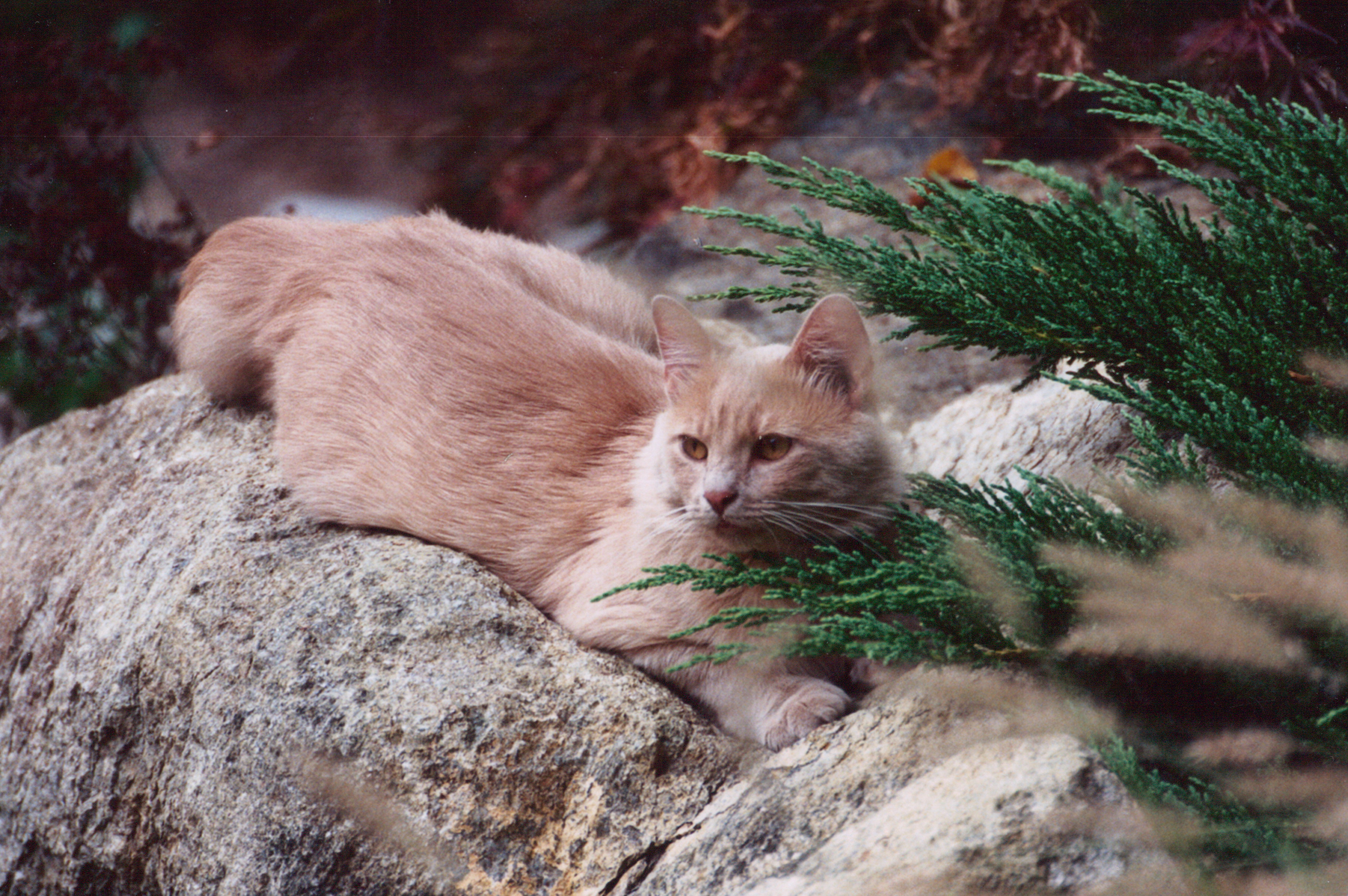 Orange cat resting on a rock, surrounded by greenery.