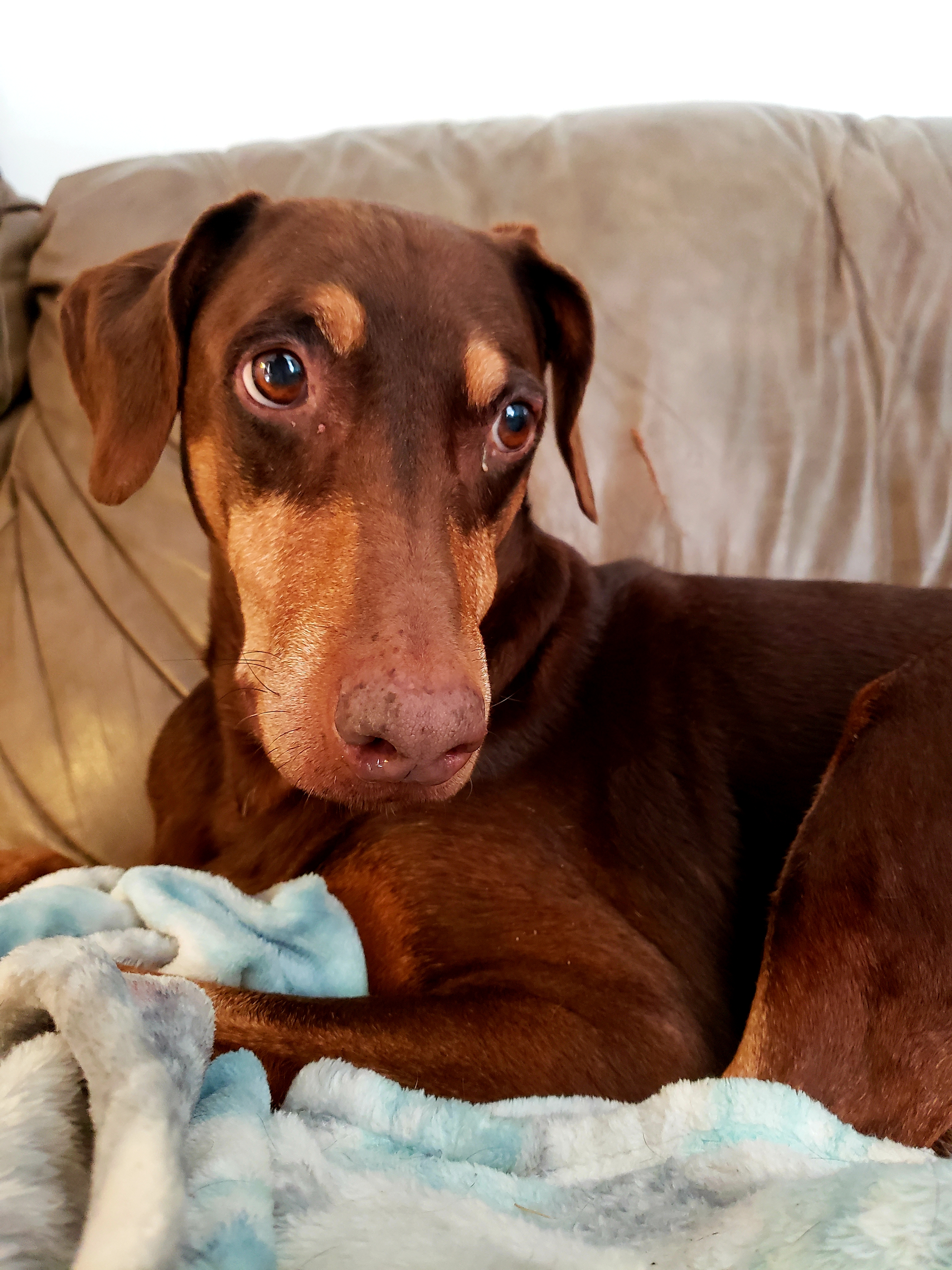 Oil painting of a brown Doberman Pinscher.