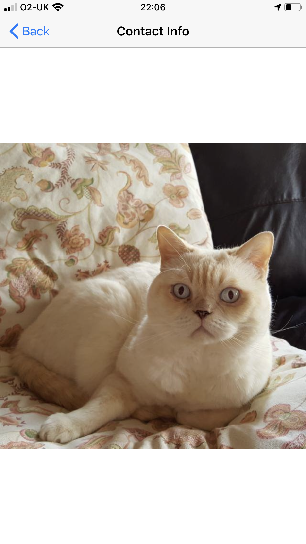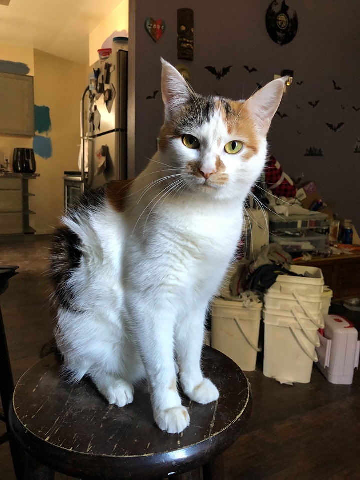 Painting of a cream-colored cat with blue eyes sitting on a floral chair.