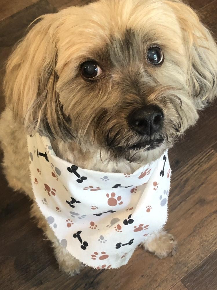 Painting of a long-haired light brown dog wearing a bandana with paw prints and bone designs.
