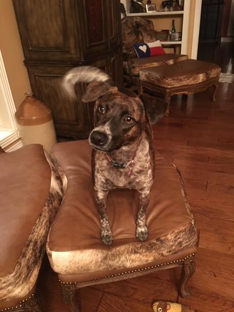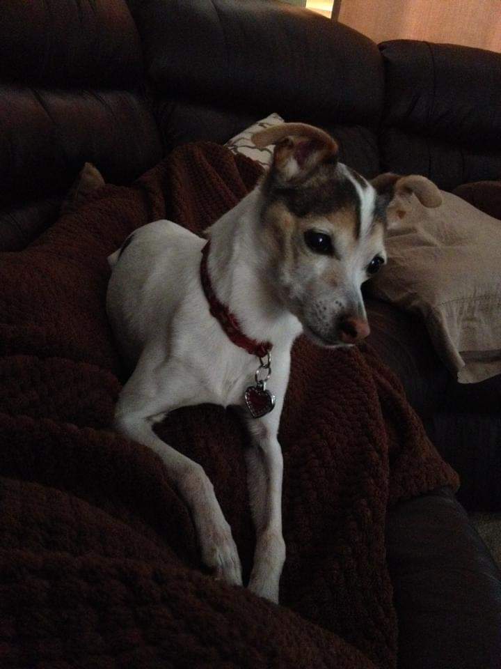 Painting of a small, white and brown dog wearing a red collar and heart-shaped tag, lying on a dark red couch.