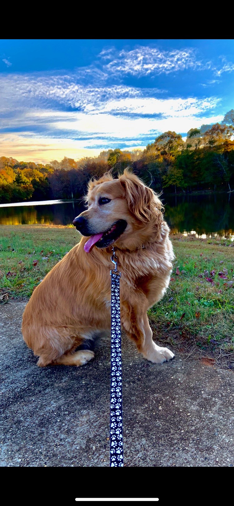 Painting of a golden retriever sitting outdoors near a lake and trees.
