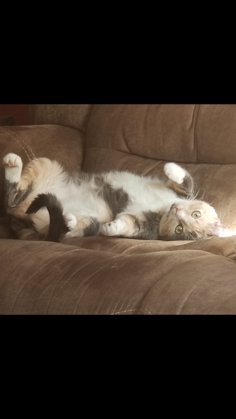Calico cat lying on its back on a brown couch.