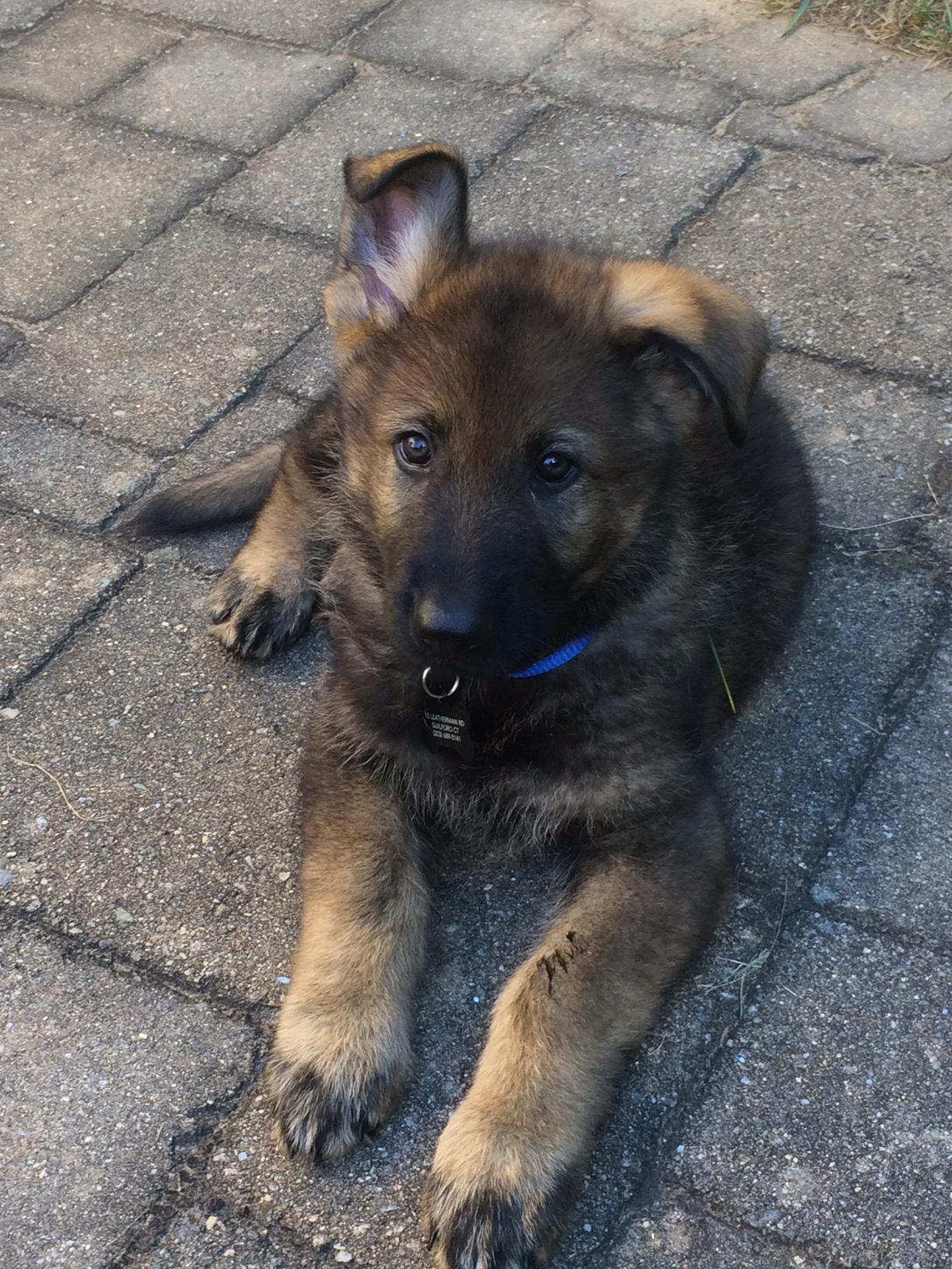 Painting of a German Shepherd puppy lying on a stone patio, wearing a blue collar.