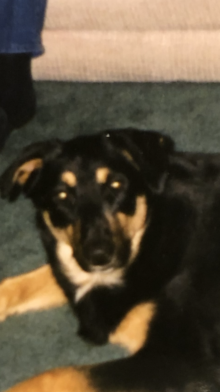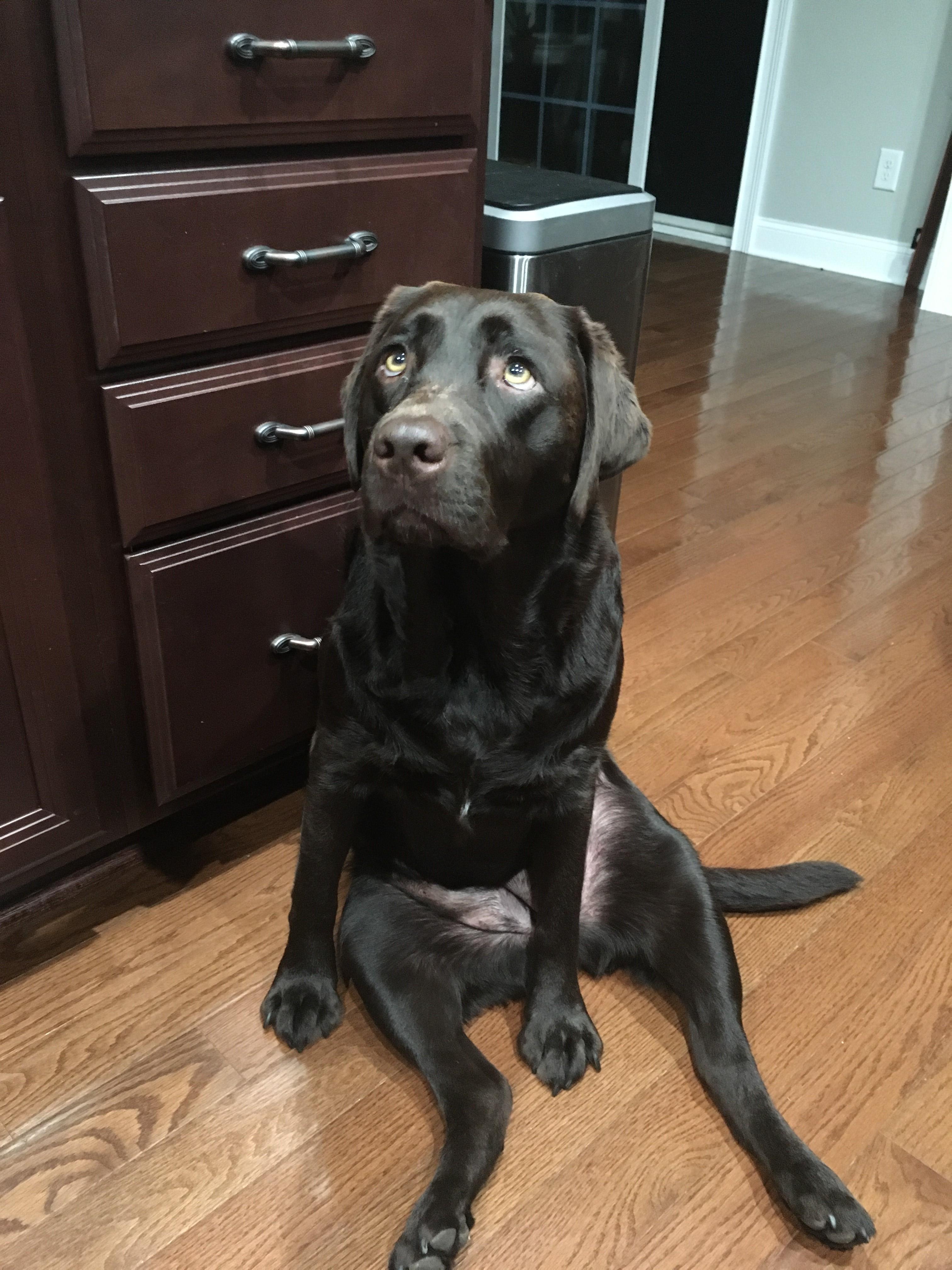 Painting of a black Labrador Retriever sitting on a hardwood floor, looking upward.