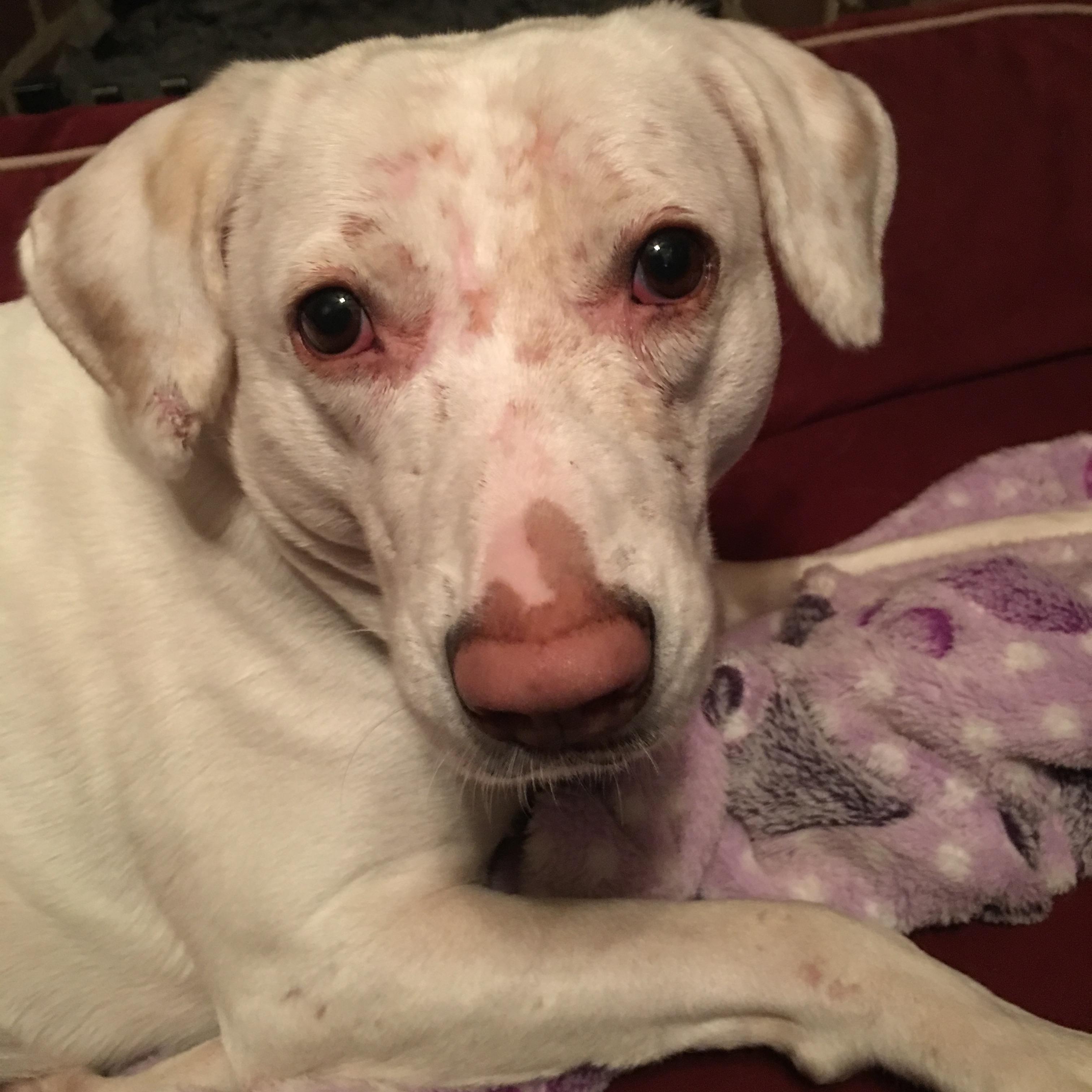 Painting of a white dog with brown eyes resting on a purple blanket against a blue background
