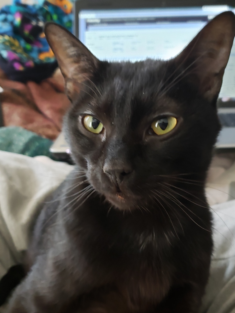 Painting of a black cat with yellow eyes