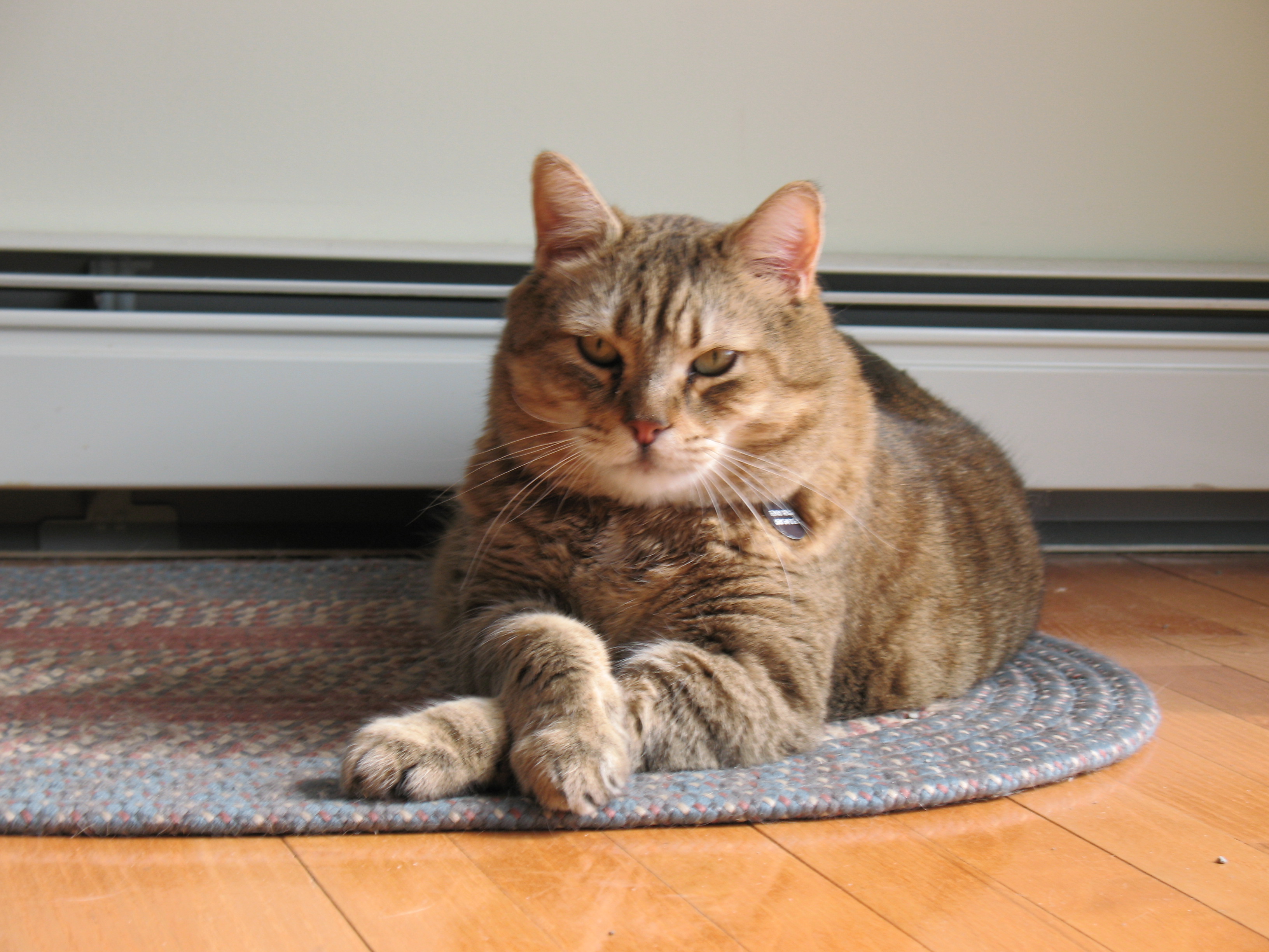 Painting of an orange tabby cat wearing a teal collar