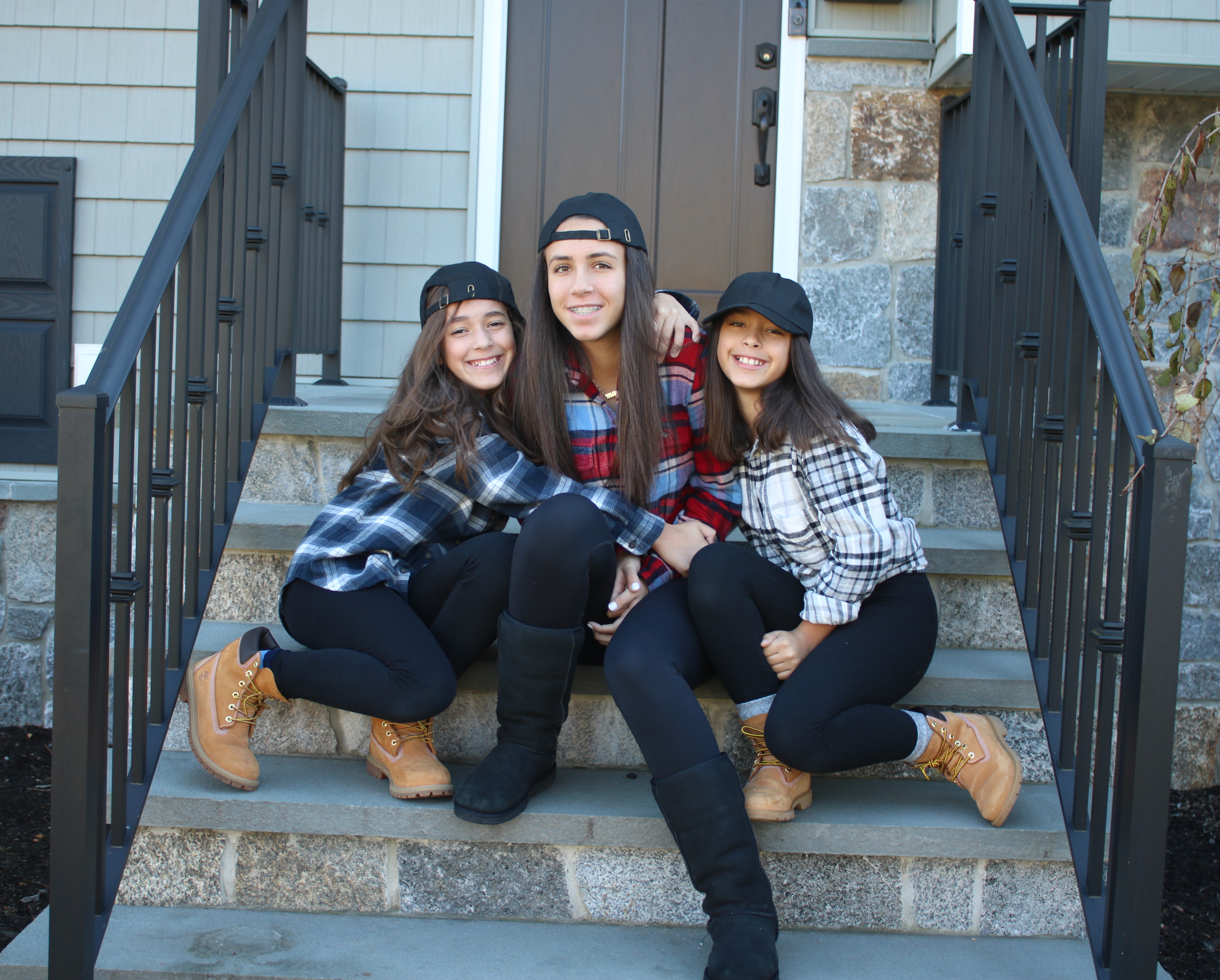Painted portrait of three sisters sitting on steps, wearing baseball caps and plaid shirts.