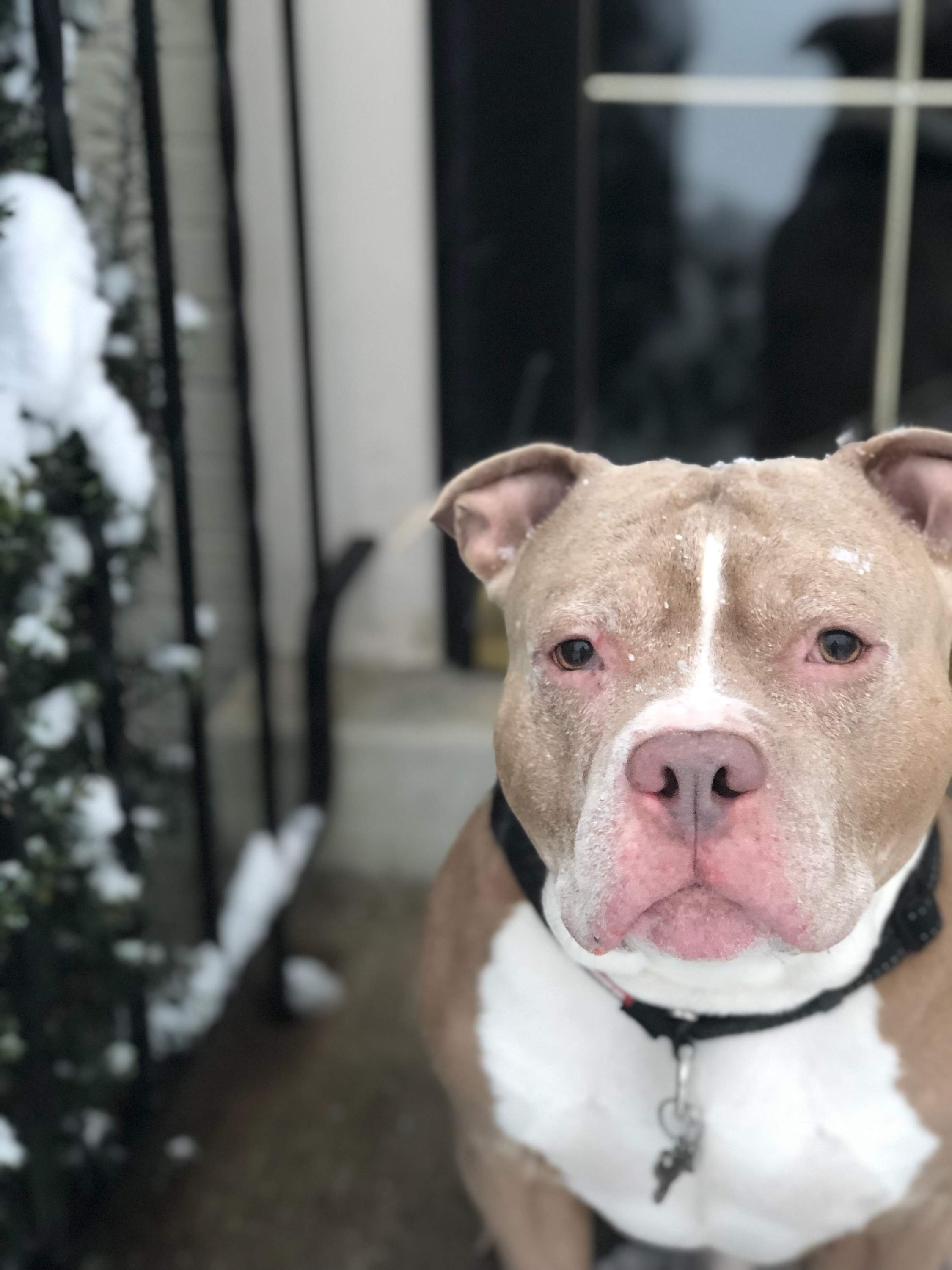 Painting of a fawn-colored Pit Bull wearing a black collar.