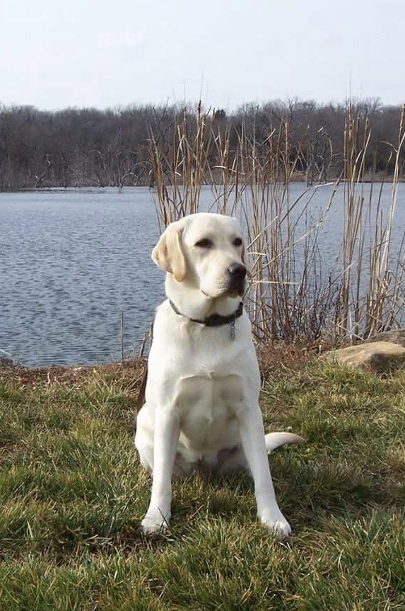Painting of a yellow Labrador puppy wearing a red collar