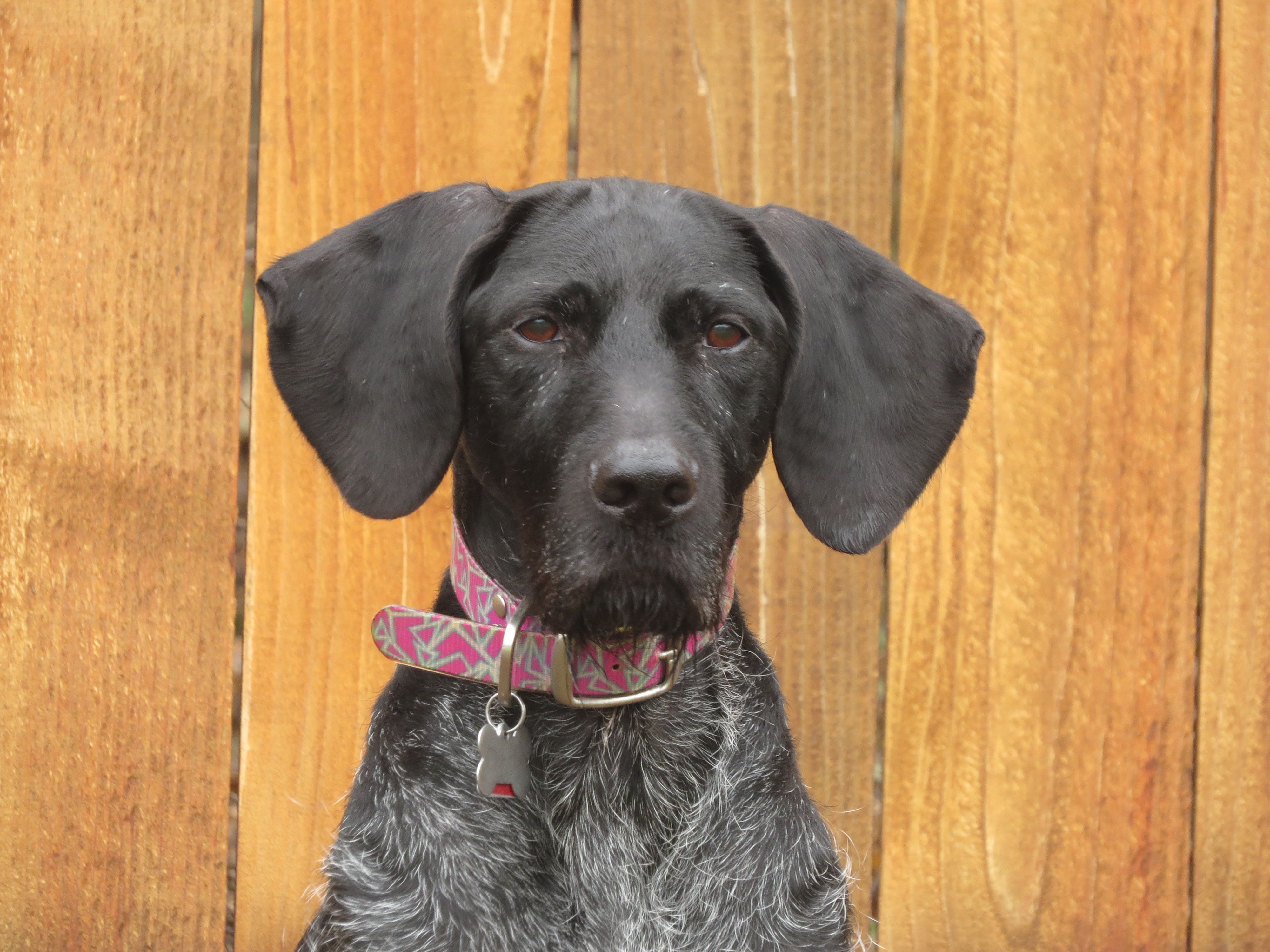Painting of a black dog wearing a pink collar against a wood background