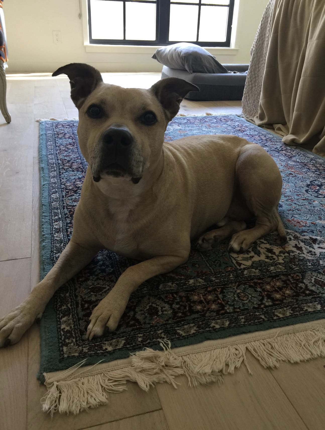 Painting of a light brown dog lying on a blue rug.