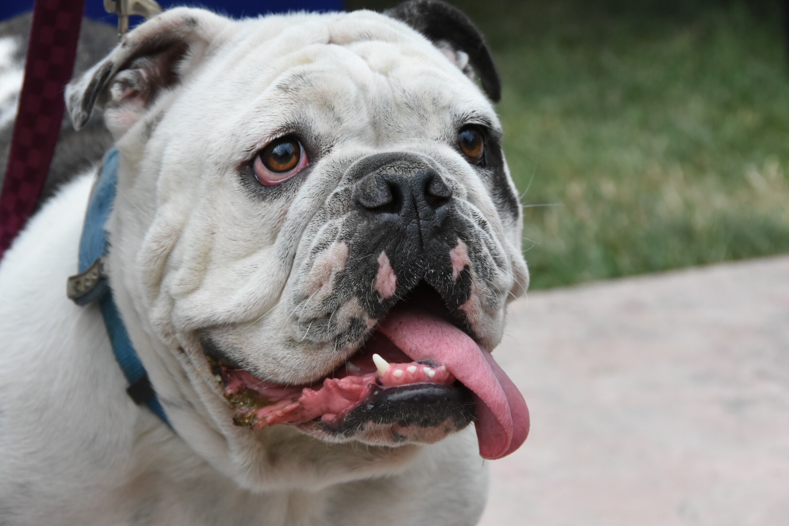 Painting of a white bulldog with a blue collar, tongue out.