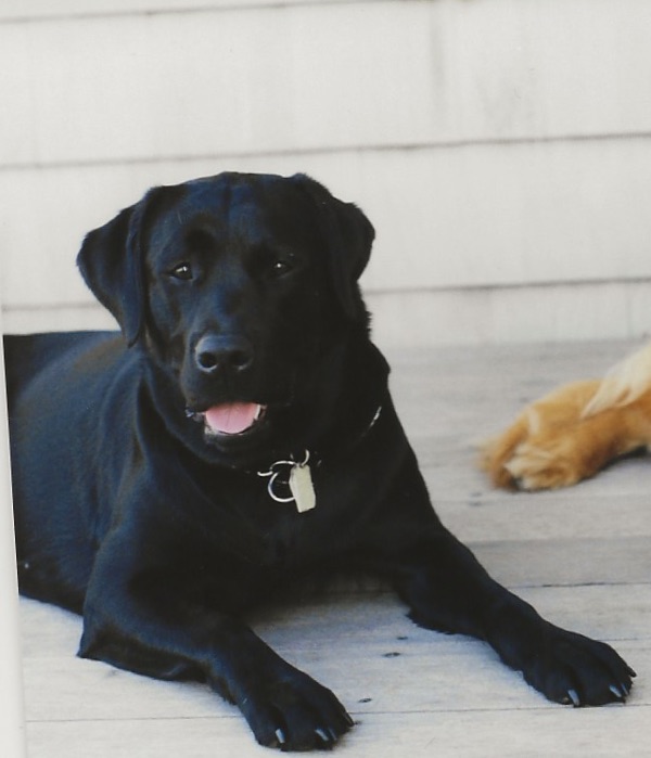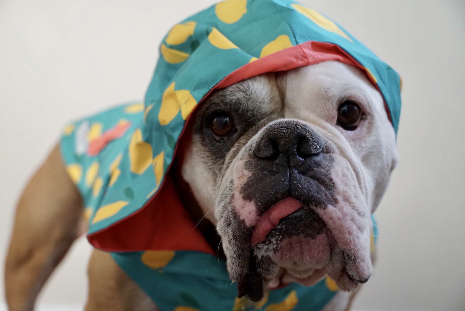 Painting of a bulldog wearing a teal hooded raincoat with yellow and red accents.