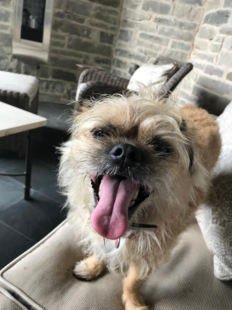 Painting of a small, light brown dog with its tongue out, sitting on a light-colored surface.