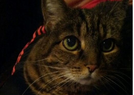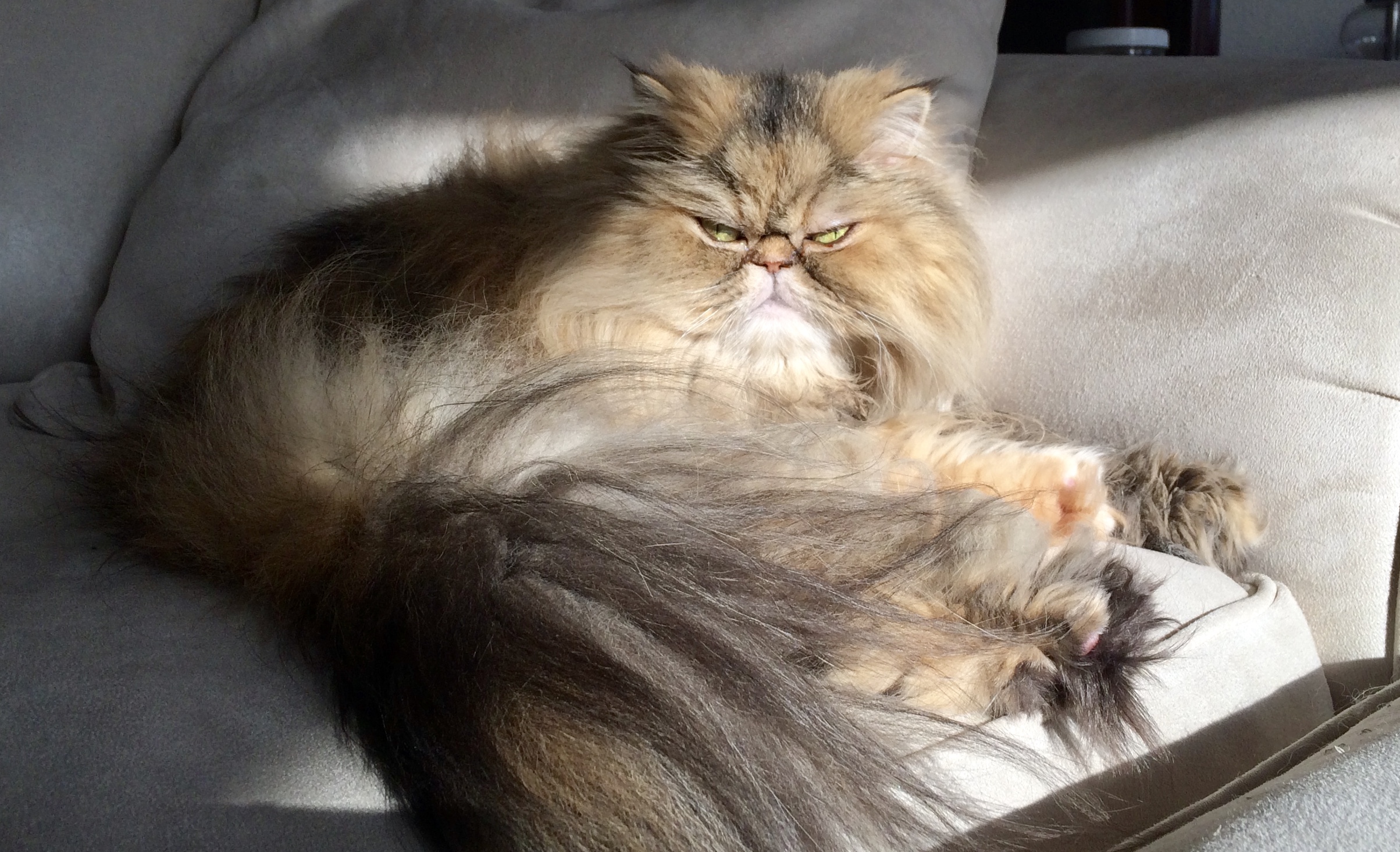 Painting of an angry-looking longhaired cat lounging on a light gray surface.