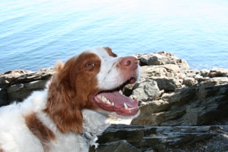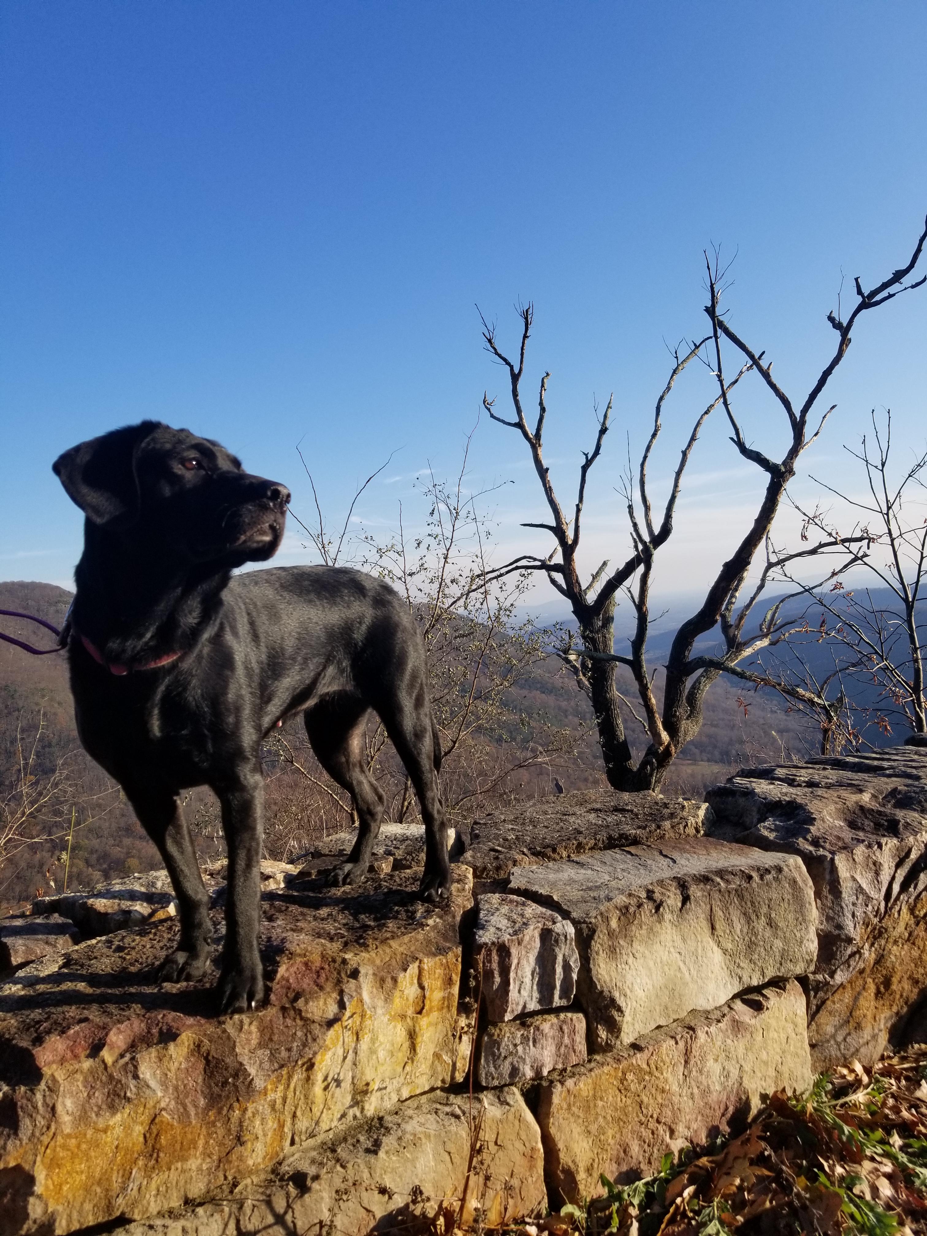 Painting of a black Labrador Retriever standing on a rock, looking into the distance.